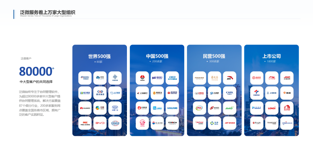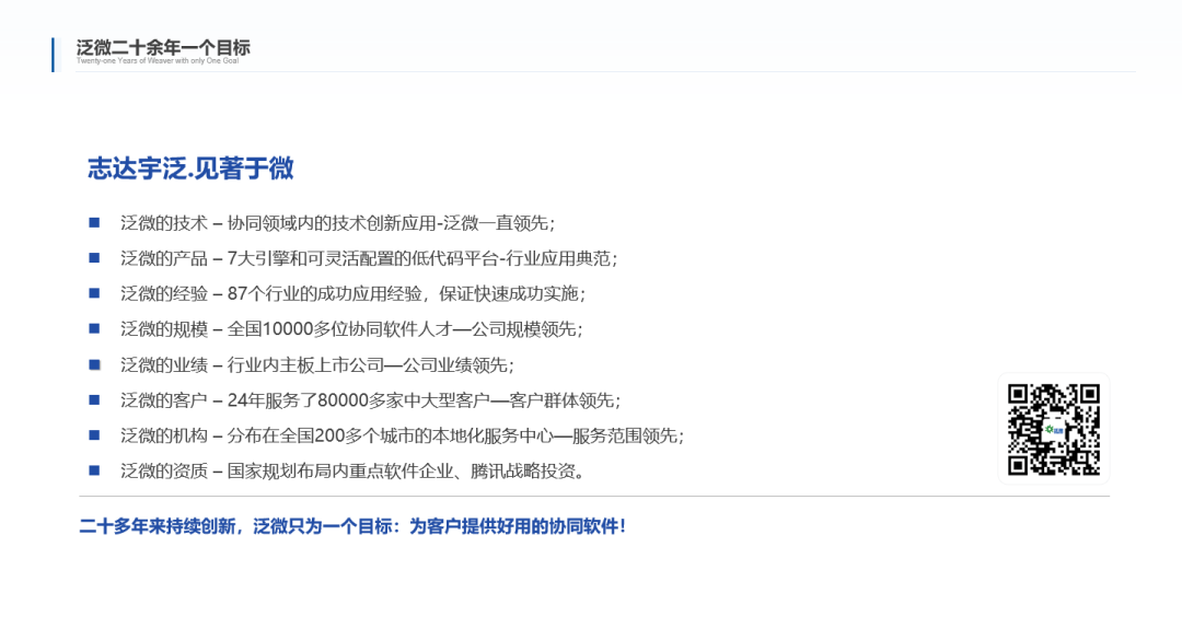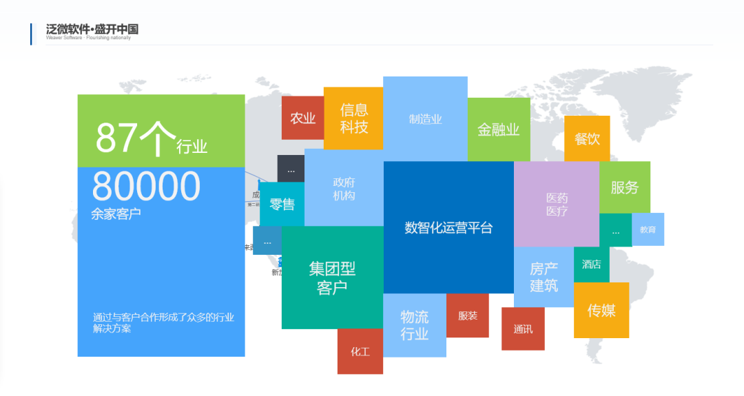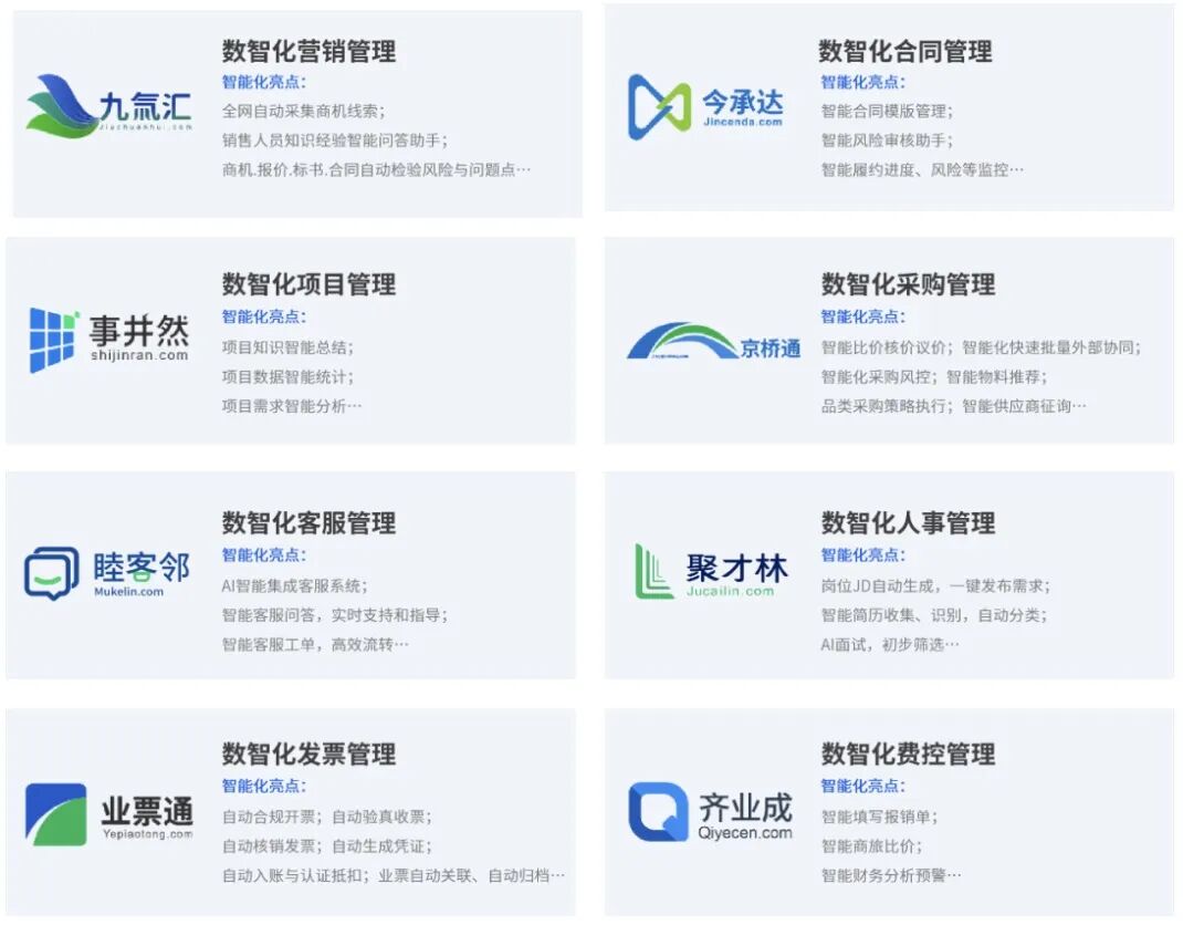 泛微的十七大专项产品与智能化技术进行融合,帮助客户从市场到销售、合同、采购、项目、客服、人事、财务、资产、档案等各个业务环节全面智能化升级,实现业务的全程数智化。