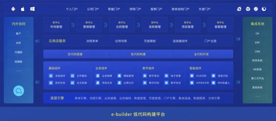 目前,泛微E10已经具备四大核心能力:架构及基础公共能力、低代码引擎能力、开放扩展能力、迁入迁出安装能力,正是由于泛微E10平台坚实的基础能力和开放能力,可以让不懂代码的客户也能随时构建各种管理应用,所有伙伴、客户都可以自己构建应用并可以共享应用。