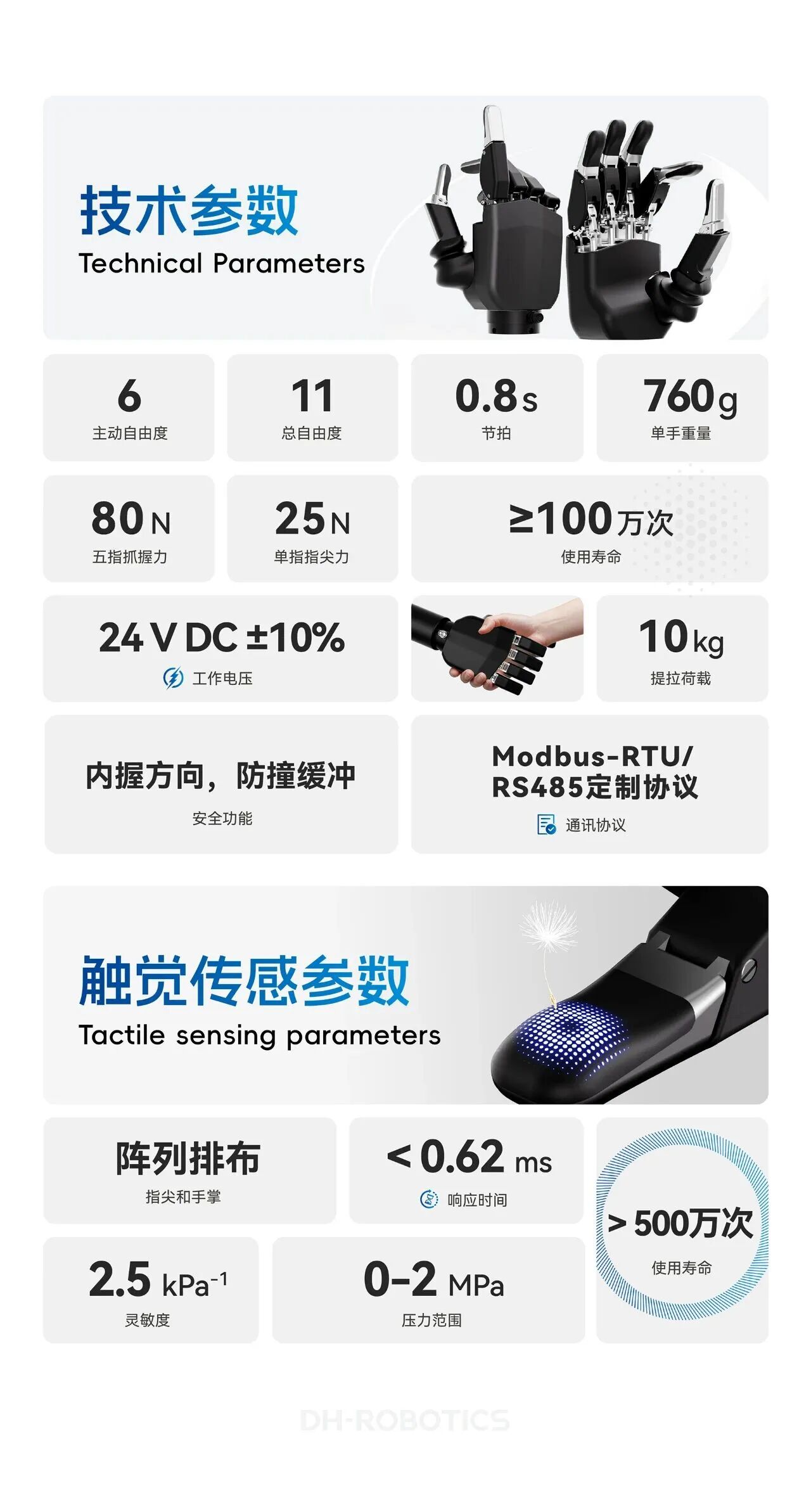 11 个自由度 + 自主研发微型伺服电缸,让它单指 25N 指尖力、10kg 提拉荷载,既能夹起薯片也能举起哑铃;选配全域触觉传感器,实时感知物体材质与压力,实现类人手柔性抓取。更硬核的是,百万次可靠作业寿命达行业 3 倍以上,抗冲击、低故障适配高频场景。