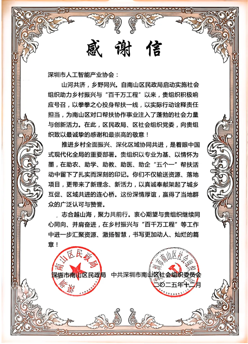 2025年12月22日,由深圳市民政局指导,南山区民政局主办的“南山区第八届社会组织嘉年华”隆重举行。深圳市人工智能产业协会受邀出席并荣获主办方颁发的感谢信,以表彰协会在助力乡村振兴与“百千万工程”中的突出贡献。
