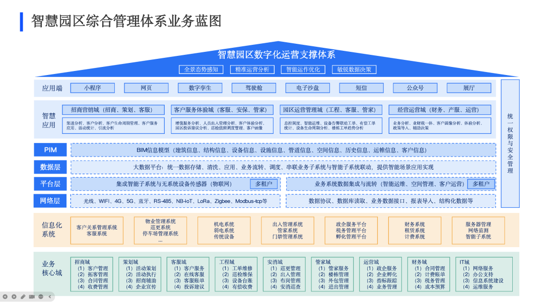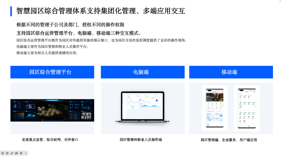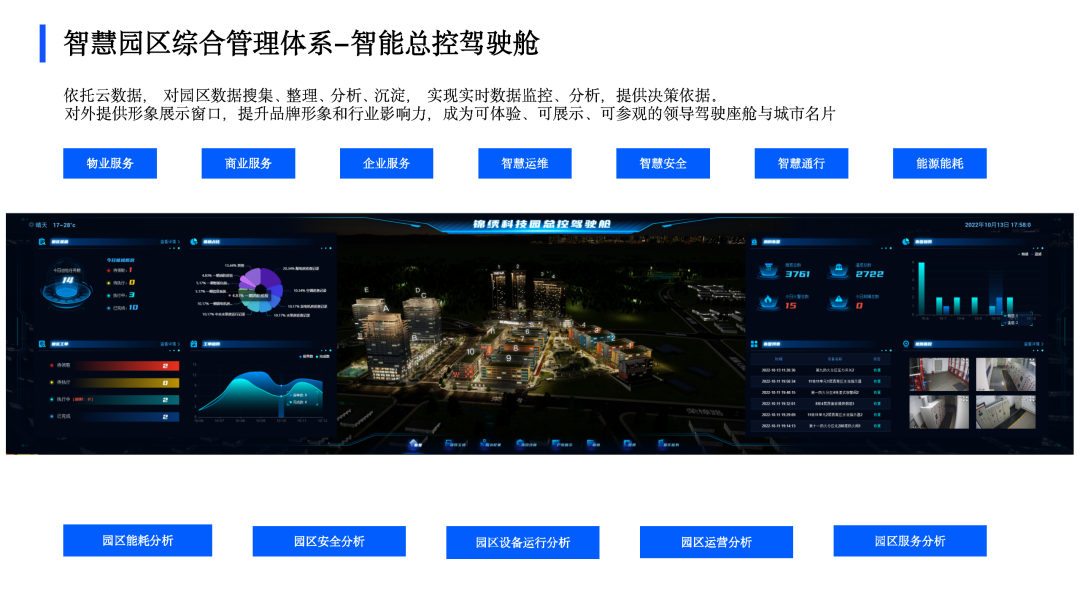 公司围绕“智慧园区综合管理体系”,构建了覆盖园区管理、园区运营、多元化服务三大业务板块的产品矩阵,具体包括: