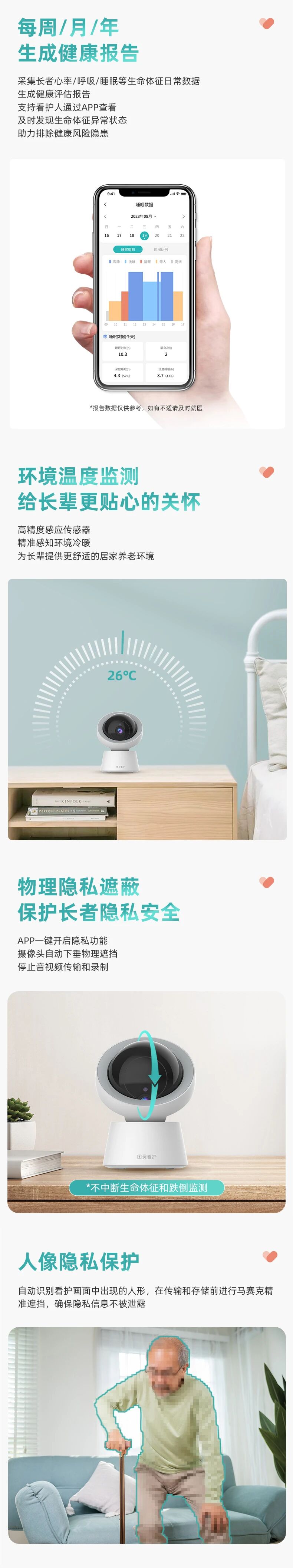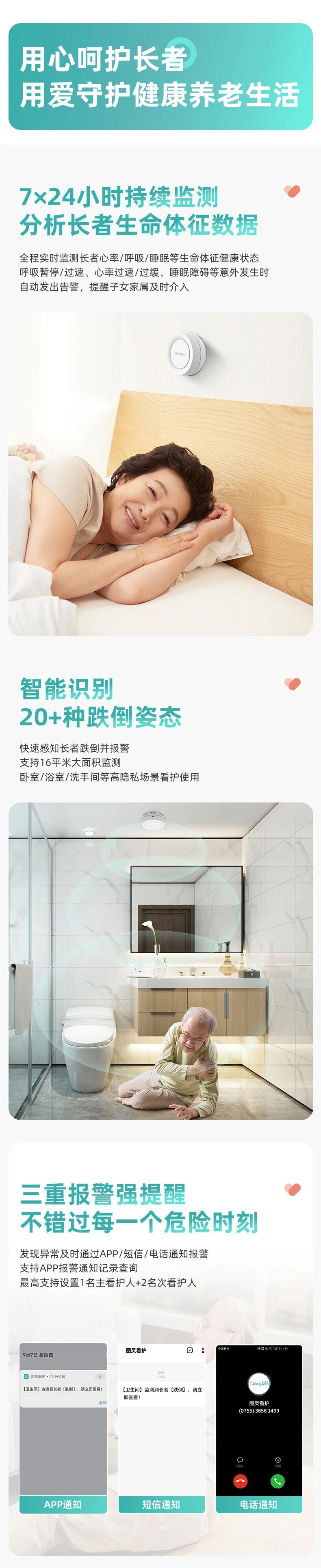 2. 无创健康监测:准医用级监测心率、呼吸、睡眠,无需穿戴设备,数据异常提前预警,避免小病变大病。