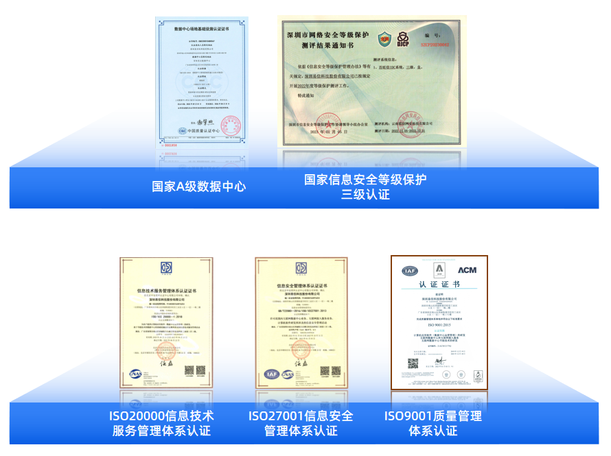 在提供高效算力的同时,易信深知稳定与安全是企业创新的生命线。百旺信智算中心参照TierⅣ容错级设计,已通过国家A级机房、三级等保、ISO9001质量管理、ISO27001信息安全、ISO20000信息技术服务管理体系认证。同时,配备7×24小时专业运维团队,结合智能化运维系统,实现机房温度、设备状态的实时监测与调控。从硬件标准到运维服务的全方位高可靠保障,确保AI计算全天候稳健运行,赋能AI客户创新发展。
