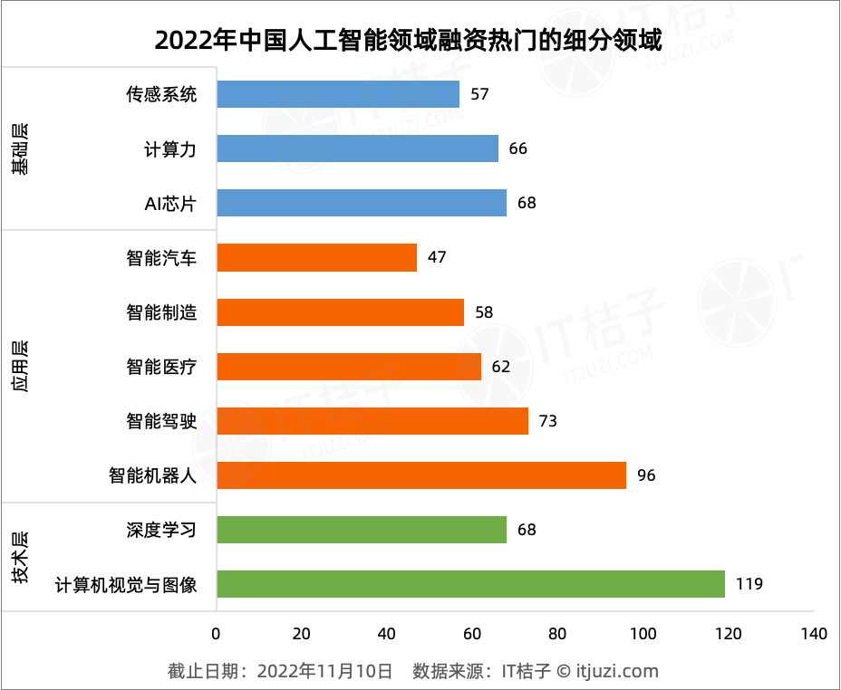 从细分领域来看,2022年融资最多的AI领域是技术层的计算机视觉与图像,今年有113起风险投资事件;排在第二位的是应用层的智能机器人项目,今年有96起风投事件;排在第三的是应用层的智能驾驶/自动驾驶项目,今年有73起风投事件。