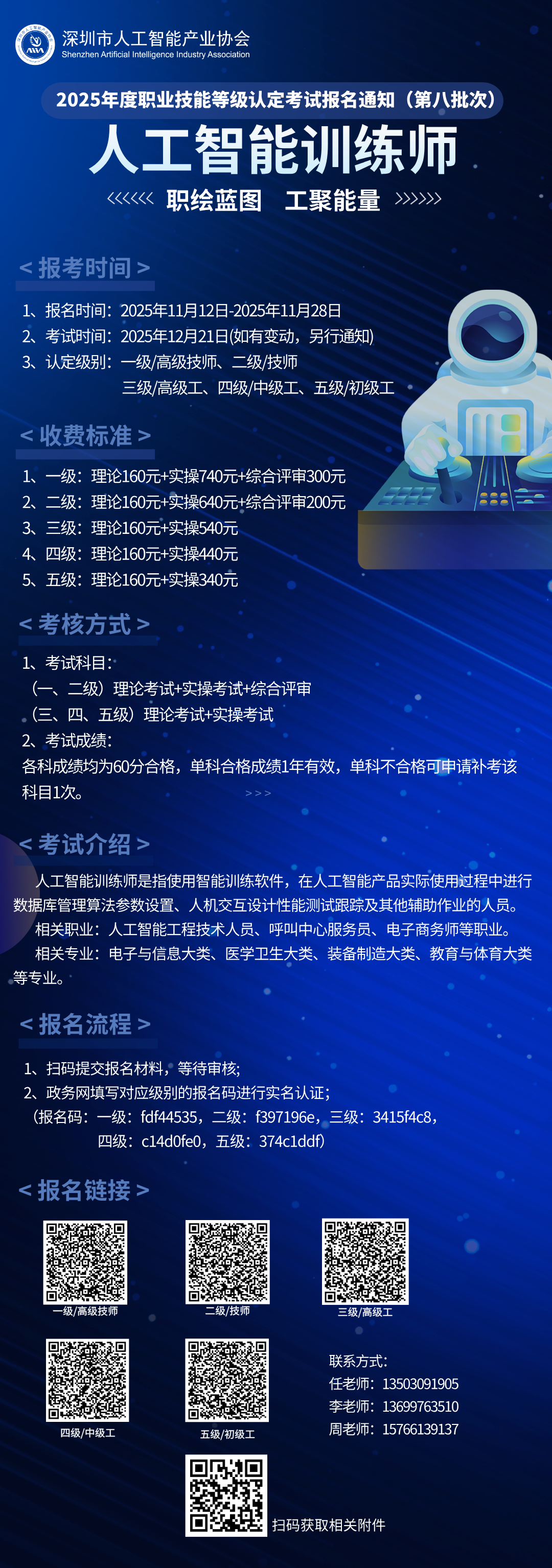为贯彻落实国家和广东省技能人才评价制度改革的要求,根据省人力资源和社会保障厅有关职业技能等级认定工作系列文件规定的要求,结合统筹规划,现对做好2025年第七批深圳市人工智能产业协会职业技能等级认定有关工作,安排如下: