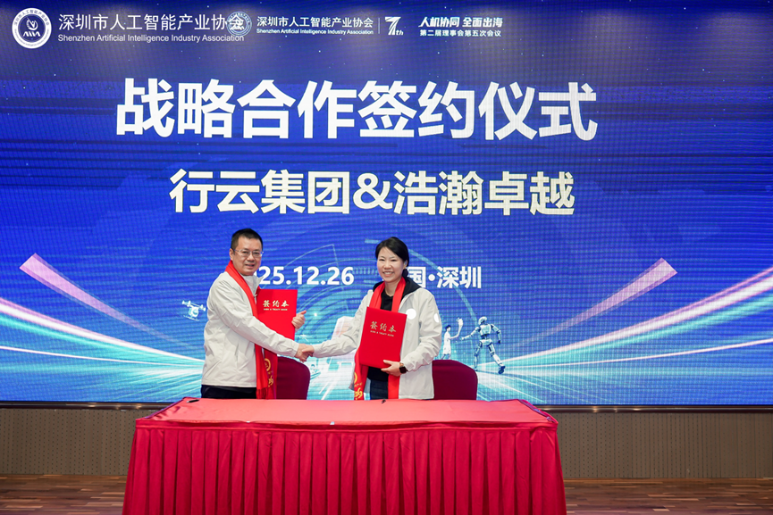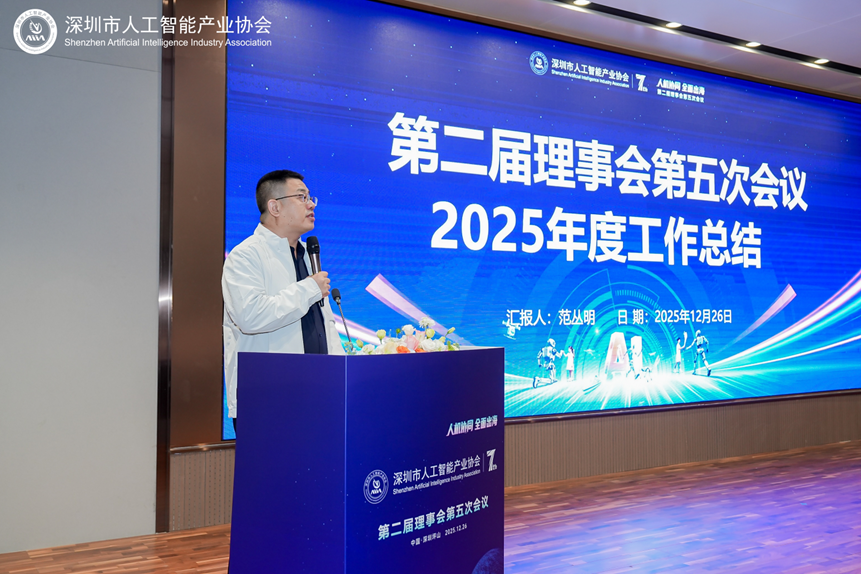 2025年12月26日,深圳市人工智能产业协会第二届理事会第五次会议在坪山燕子湖国际会展中心隆重举行。本次会议以“人机协同,全面出海”为主题,国家广电总局原副局长乐玉成、深圳市前海深港现代服务业合作区管理局原副局长王锦侠、协会会长夏佐全、监事长徐明、高级顾问葛明、执行会长范丛明等领导嘉宾及理事会成员100多人出席会议,共同回顾2025年“可持续发展年”成果,谋划2026年“全面出海年”战略布局。