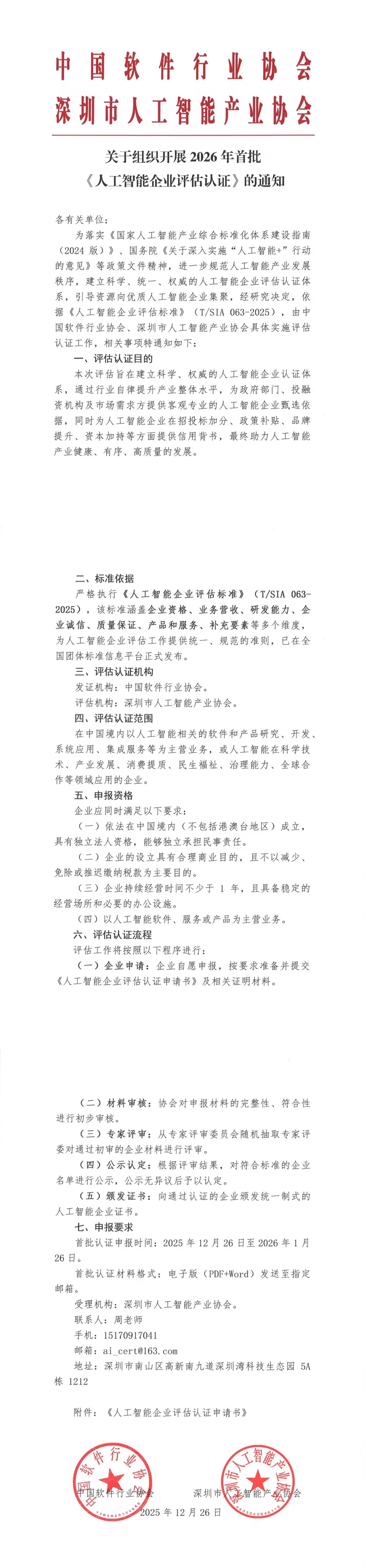 【重要通知】关于组织开展2026年首批《人工智能企业评估认证》的通知