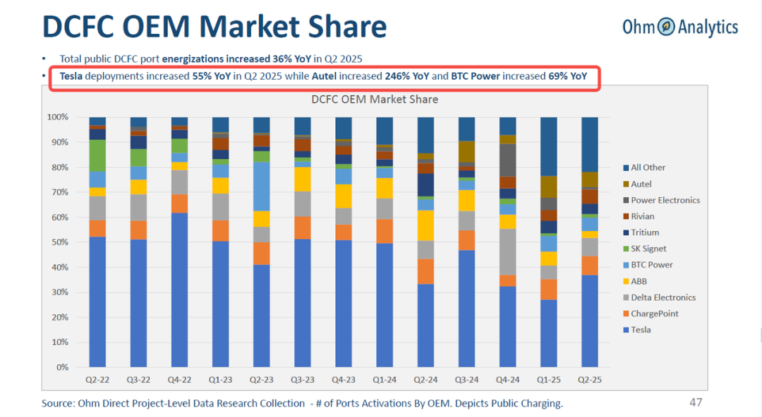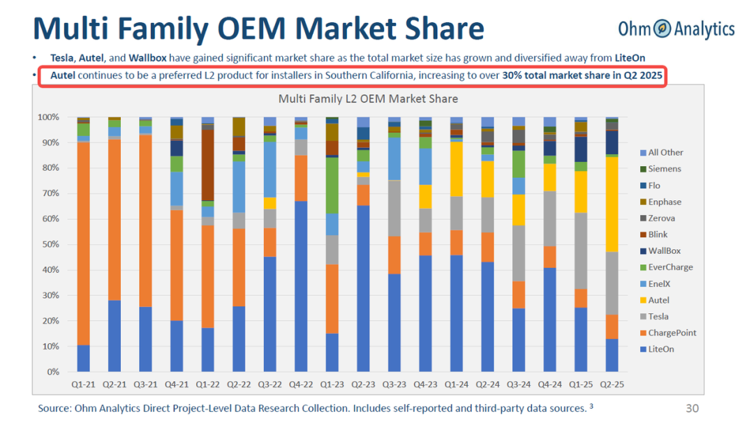 根据能源研究与分析机构 Ohm Analytics 最新发布的《2025年第二季度美国电动汽车充电市场报告》,美国电动汽车充电基础设施进入稳健增长阶段,其中多户住宅和高功率直流快充成为最受关注的细分赛道。报告显示,在2025年第二季度,道通在美国多户住宅L2充电总市场份额超过30%,超越特斯拉,拿下第一名的成绩。 作为成立于2018年的专业研究机构,Ohm Analytics 专注于分布式能源转型,覆盖电动汽车充电、太阳能、储能、虚拟电厂等多个领域,其客户包括600多家全球领先的OEM、开发商、软件及公用事业企业,是行业公认的权威市场信息来源。