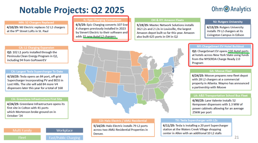 这些产品优势已在多个项目中获得验证。报告提到,道通也在纽约和伊利诺伊等重点州份实现落地:ChargeSmart EV借助州激励计划在酒店部署了 130个道通 L2端口,而 Epic Charging 则在改造站点中新增了 31个道通充电桩,充分体现出道通在新建与升级市场的双重优势。