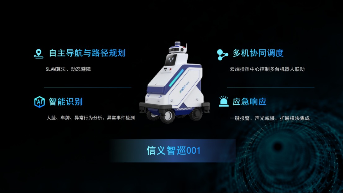2025年,广电信义推出新一代警用巡逻机器人——信义智巡001,该款机器人面向公共安全领域并提供定制化开发,自研导航与路径规划算法、具备视觉识别与应急响应能力,可协同警力进行室内外巡逻执勤任务,并将数据实时回传至机器人管理平台,跨品牌、多形态设备的统一接入可实现多机协同、远程指挥、快速联动处置,并可以根据不同的业务场景进行定制化开发适配多场景融合。