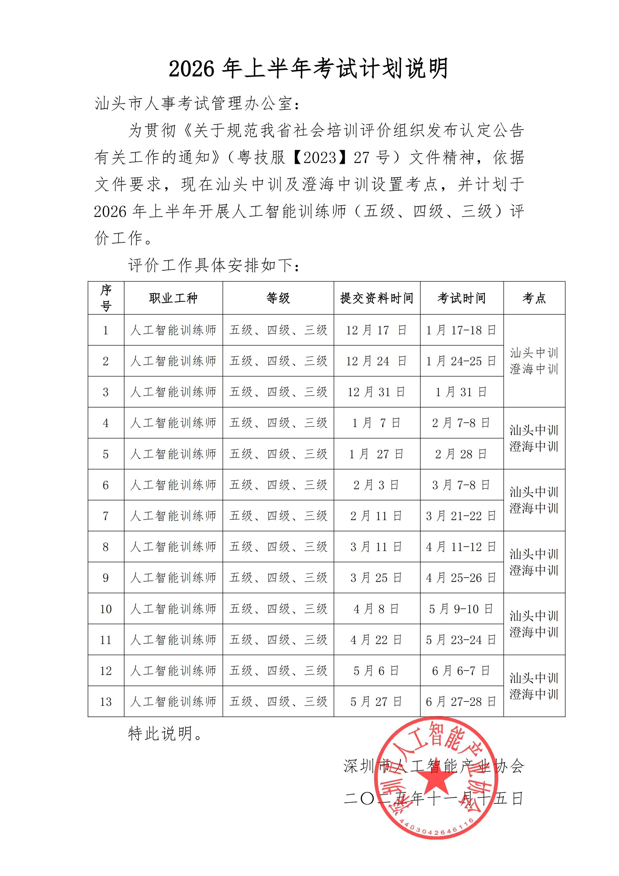 【考试通知】关于做好2026年上半年汕头人工智能训练师考试计划工作的通知