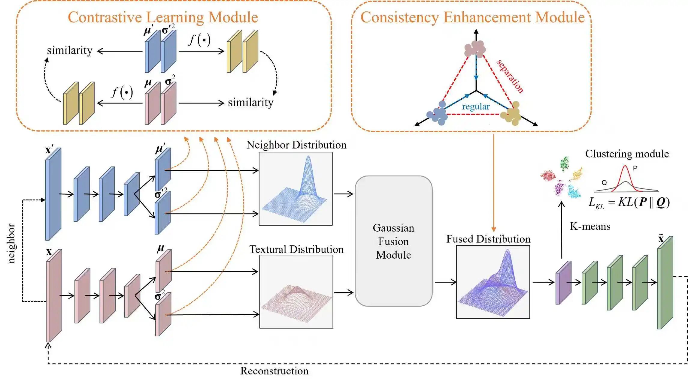 文本聚类是文本挖掘与信息检索的重要任务。尽管变分自编码器(VAE)能通过潜在分布建模文本表示,但其主要依赖文本自身特征,忽视数据集层面的邻域信息,难以克服文本稀疏与高维性导致的表示不完整与分布失真问题。为解决这一问题,论文提出了一种对比高斯融合网络(Contrastive Gaussian Fusion Network, CGFN),旨在构建文本的超级表示(superior representations beyond the original documents)。CGFN在潜在空间中将文档的语义特征与邻域派生信息以高斯分布形式融合,通过高斯融合机制实现多源信息的平滑对齐与结构增强,从概率层面提升表示空间的连续性与可辨识性。此外,对比学习被融入融合过程,以判别性约束优化潜在分布,使模型在抑制噪声的同时保持信息的完整性与判别力。由此生成的潜在表示并非原始文档特征的压缩,而是一种经由分布融合与对比重构的超级表示,能够捕获跨文档的语义关联与结构模式。实验结果表明,CGFN在四个真实世界数据集上显著优于现有最先进方法,能够通过稳健地捕捉全局分布与邻域模式,实现更优的聚类效果。