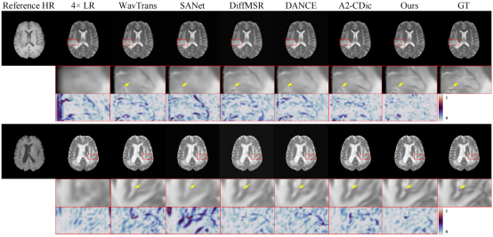 在多个公开MRI数据集上的实验结果表明,CD-DPE不仅能够清晰还原精细的解剖结构,显著提升图像锐度与抑制伪影,而且在整体重建精度与临床可用性方面均优于现有主流方法,为多对比度MRI超分辨率重建提供了新思路与技术支撑。