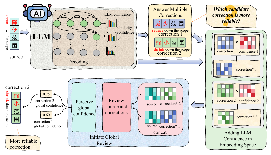 中文语法错误纠正(Chinese Grammar Error Correction,CGEC)旨在识别并纠正中文句子中存在的语法错误。微调大模型纠正语法错误已成为主流方法,但存在明显缺陷:LLMs学习了语法知识,但常常不能明确使用哪种语法概念去纠正错误句子,以致于给出多个可能的纠正,但不能明确哪个纠正是可靠的。相较之下,人类存在一种直觉思维(Intuitive Thinking),使得人类可以凭借经验和直觉来快速决策哪一个纠正更可靠。为了弥补LLMs这种缺陷,该论文提出了Expanding Intuitive Thinking(ExIT)模型以模仿人类的直觉思维。ExIT依托轻量化架构,融合LLMs纠错的置信度信息,快速决策不同纠正中更可靠的一个纠正作为最终纠正。在这个过程中,ExIT对比了原始句子与纠正之间的关联性。与仅解码LLMs基于前置token进行局部思考的方式不同,ExIT 的全局审视更接近人类复查答案的过程。实验表明,ExIT 显著释放LLMs的纠错能力,缓解训练过程中的概念混淆,且可迁移至不同LLMs。