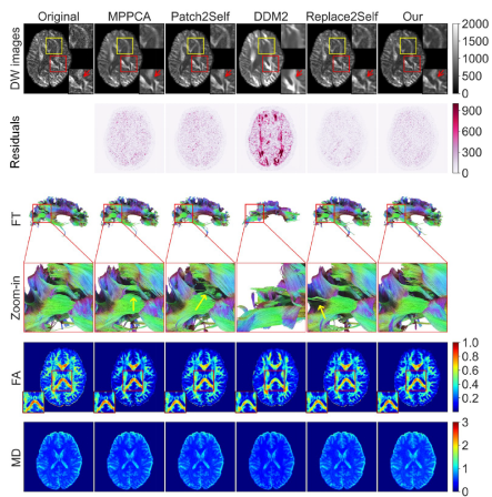 研究团队在多种模拟与真实数据集(包括脑与心脏DWI)上验证了UP²-MAE的有效性。实验结果显示,该模型在图像质量(PSNR 31.48 dB、SSIM 0.98)及扩散张量指标(FA、MD)上均显著优于现有方法,能够在抑制噪声的同时保留微结构细节。该研究为自监督医学影像去噪提供了一种融合物理约束与深度学习优势的新范式,为高质量图像重建与精准诊断提供了新的技术路径。