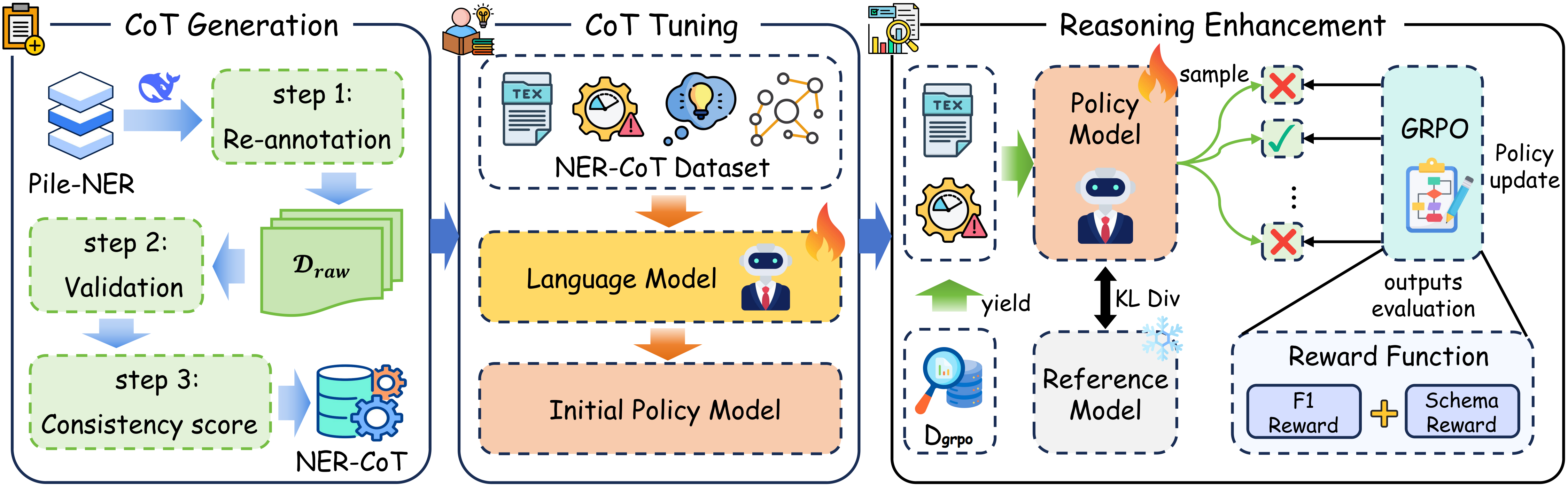 命名实体识别(NER)任务中,生成式大语言模型(LLMs)通常依赖指令调优,通过隐式的语义模式匹配来提取实体,但它们普遍缺乏一个明确且可验证的推理机制。这种“认知捷径”导致模型在需要推理的零样本(zero-shot)和低资源场景中表现不佳。为了解决这一难题,该论文提出了一种新的NER推理范式,旨在将实体提取从隐式匹配转向显式推理。该框架包含三个阶段:首先,构建一个面向NER的思维链(Chain-of-Thought, CoT)数据集;接着,利用该数据集进行CoT调优,训练模型在推导出最终答案之前,先生成连贯的推理步骤;最后,通过一个综合奖励信号来实施推理增强,以优化整个推理过程。实验证明,该方法(ReasoningNER)在零样本设置下取得了SOTA性能,F1分数显著超越了GPT-4 12.3个百分点,展示了其在推理导向的信息提取研究中的巨大潜力。