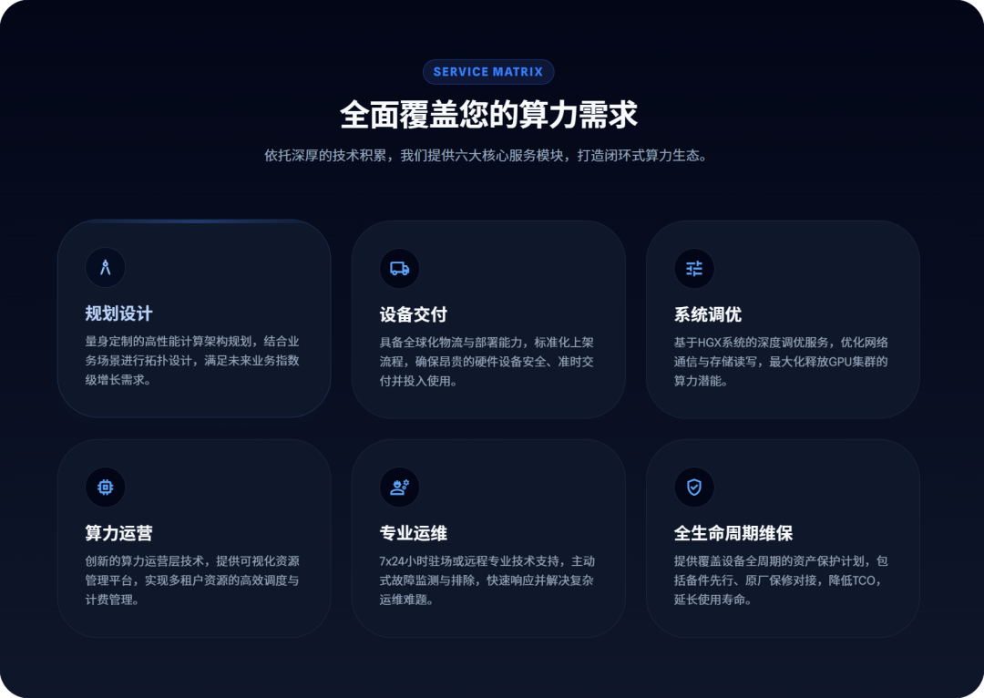 依托深厚的制造与供应链能力,腾云智算构建了覆盖“规划设计、设备交付、系统调优、算力运营、专业运维与全生命周期维保”的一站式智算服务体系。