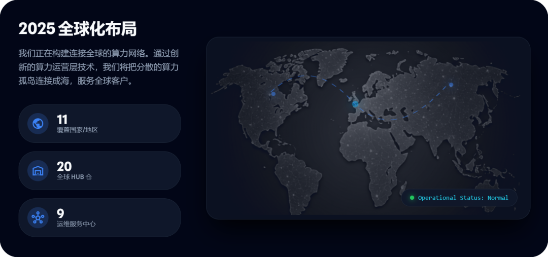 2025年,腾云智算持续拓展全球业务版图,覆盖11个国家/地区进出口主体,20个全球HUB仓,9个全球运维服务中心,为跨区域客户提供稳定、高效、可持续的算力与服务支持。