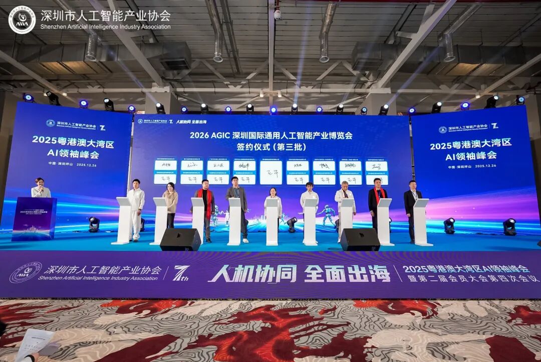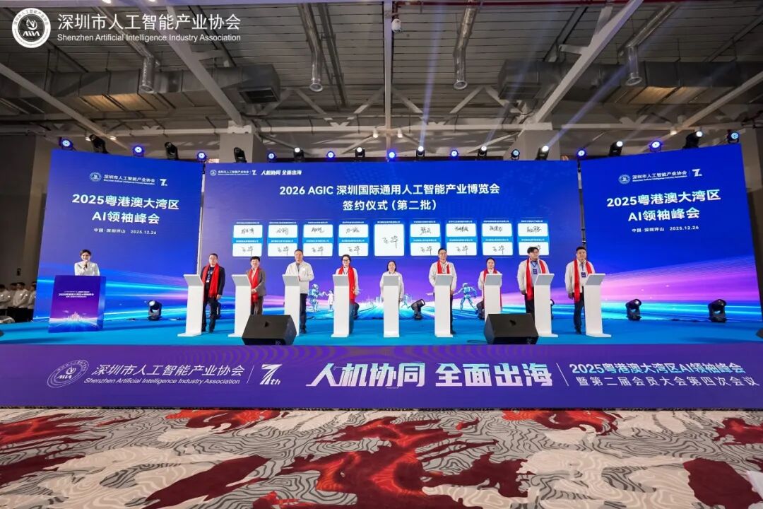 随后,举行了2026AGIC深圳国际通用人工智能产业博览会签约仪式。本届博览会以“仿生智能、无界未来”为核心主题,定于 2026年8月26日至28日在深圳(宝安)国际会展中心盛大启幕。此次签约仪式由深圳市人工智能产业协会执行秘书长、深圳鹏城会展传媒有限公司总经理王华,与铨兴科技、豪鹏科技、润建股份、百度、力维智联、美丽魔方、创通新科、北京并行科技、强达电路、华成工控、信步科技、志奋领科技、鹏城会展、华夏鲲鹏、三旺通信、鑫精诚传感、三德盈电子、御膳智能、四川全盛智能、华沿机器人、金大智能、豹拓智能、大寰机器人、安诺机器人、盛格纳电子等二十余家企业的领导及代表共同完成签约。此次签约汇聚多方产业力量,旨在整合全球AI创新资源,为湾区人工智能企业搭建起展示核心实力、对接国际商机、拓展全球市场的高端平台,助力“湾区AI力量”走向世界、链接全球。