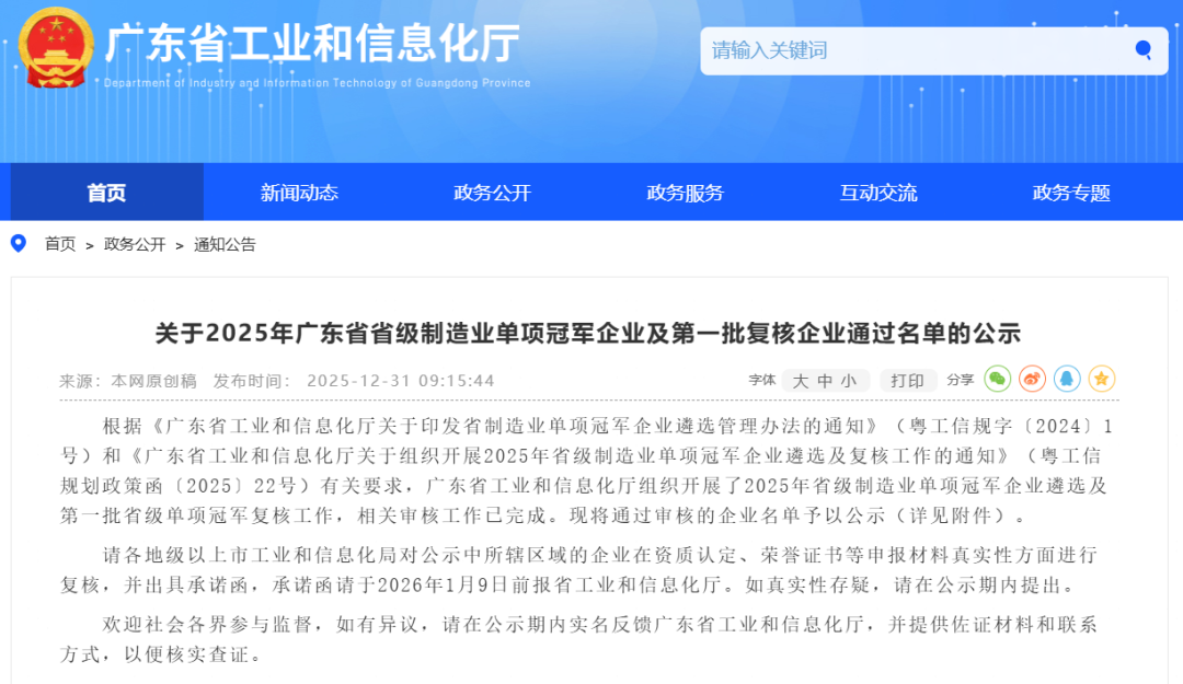 省级制造业单项冠军企业遴选,是广东省推动制造业高质量发展的重要举措,重点考察企业在细分领域的专注度、核心技术能力、产品竞争力及市场表现。进入公示名单的企业,需在相关赛道中具备长期积累形成的技术优势与稳定的行业地位。