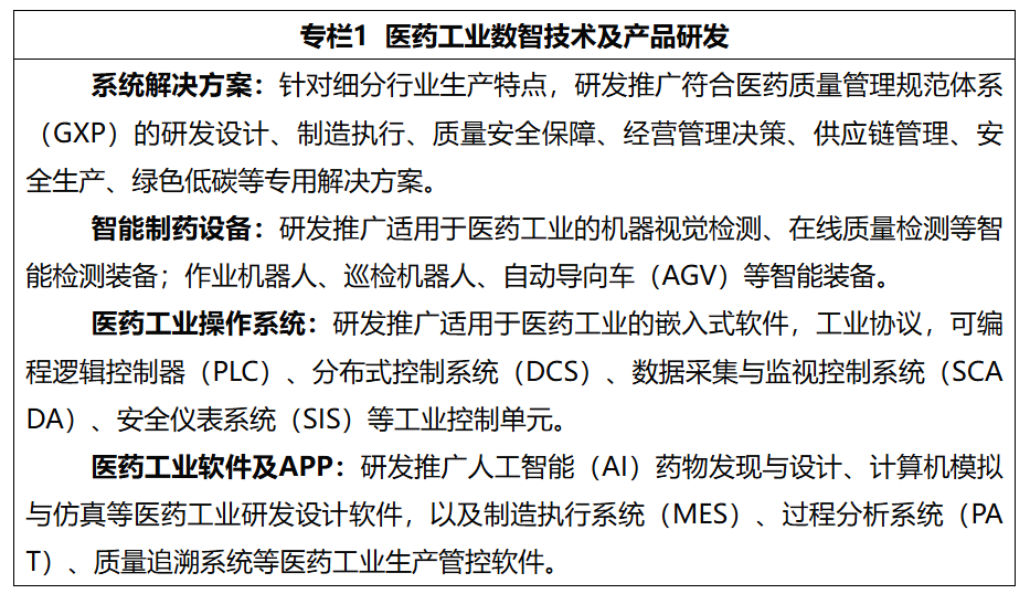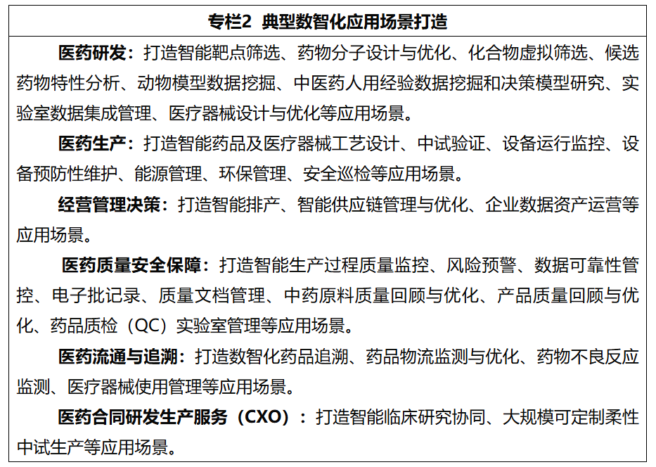1.推广典型数智技术应用卓越场景。围绕医药研发、医药生产、经营管理决策、医药质量安全保障、医药流通与追溯、医药合同研发生产服务(CXO)等方面,系统梳理数智化转型场景清单,以及数据要素、知识模型、工具软件、人才技能等要素清单,支持医药企业和信息技术服务企业联合打造数智化应用场景,系统化推进医药企业数智化转型。