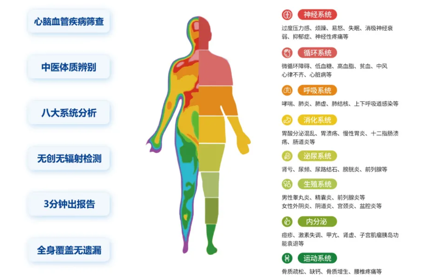 02快速筛查:用户可手动选择区域(如面部、半身、全身)进行精细扫描,生成热力图,自动分析异常区域,比如脑梗、关节炎症等潜在风险。