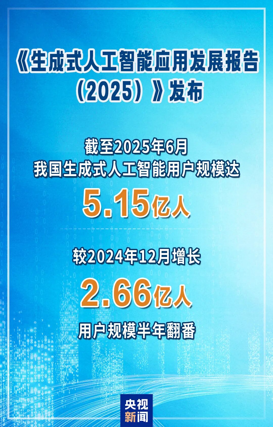 今天(18日),中国互联网络信息中心在2025(第六届)中国互联网基础资源大会上发布《生成式人工智能应用发展报告(2025)》。报告显示,截至2025年6月,我国生成式人工智能用户规模达5.15亿人,较2024年12月增长2.66亿人,用户规模半年翻番;普及率为36.5%。