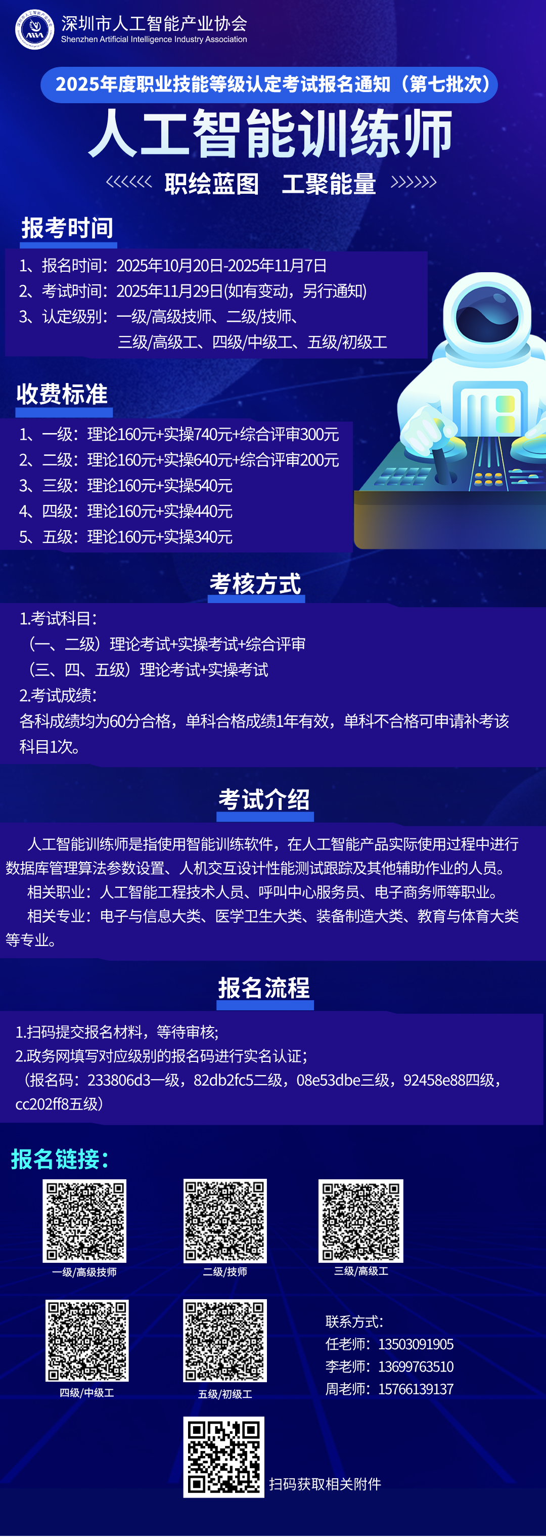 为贯彻落实国家和广东省技能人才评价制度改革的要求,根据省人力资源和社会保障厅有关职业技能等级认定工作系列文件规定的要求,结合统筹规划,现对做好2025年第七批深圳市人工智能产业协会职业技能等级认定有关工作,安排如下: