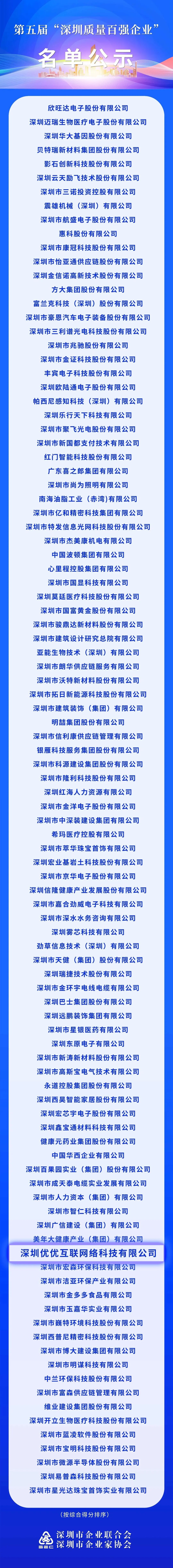 近日,第五届“深圳质量百强企业”榜单正式发布,优优互联凭借在经济指标、技术创新、服务品质等维度的卓越表现,成功斩获此项殊荣,与迈瑞、华大基因、影石、云天励飞等深圳各领域标杆企业共同彰显“深圳创造”、“深圳质量” 的硬核实力。
