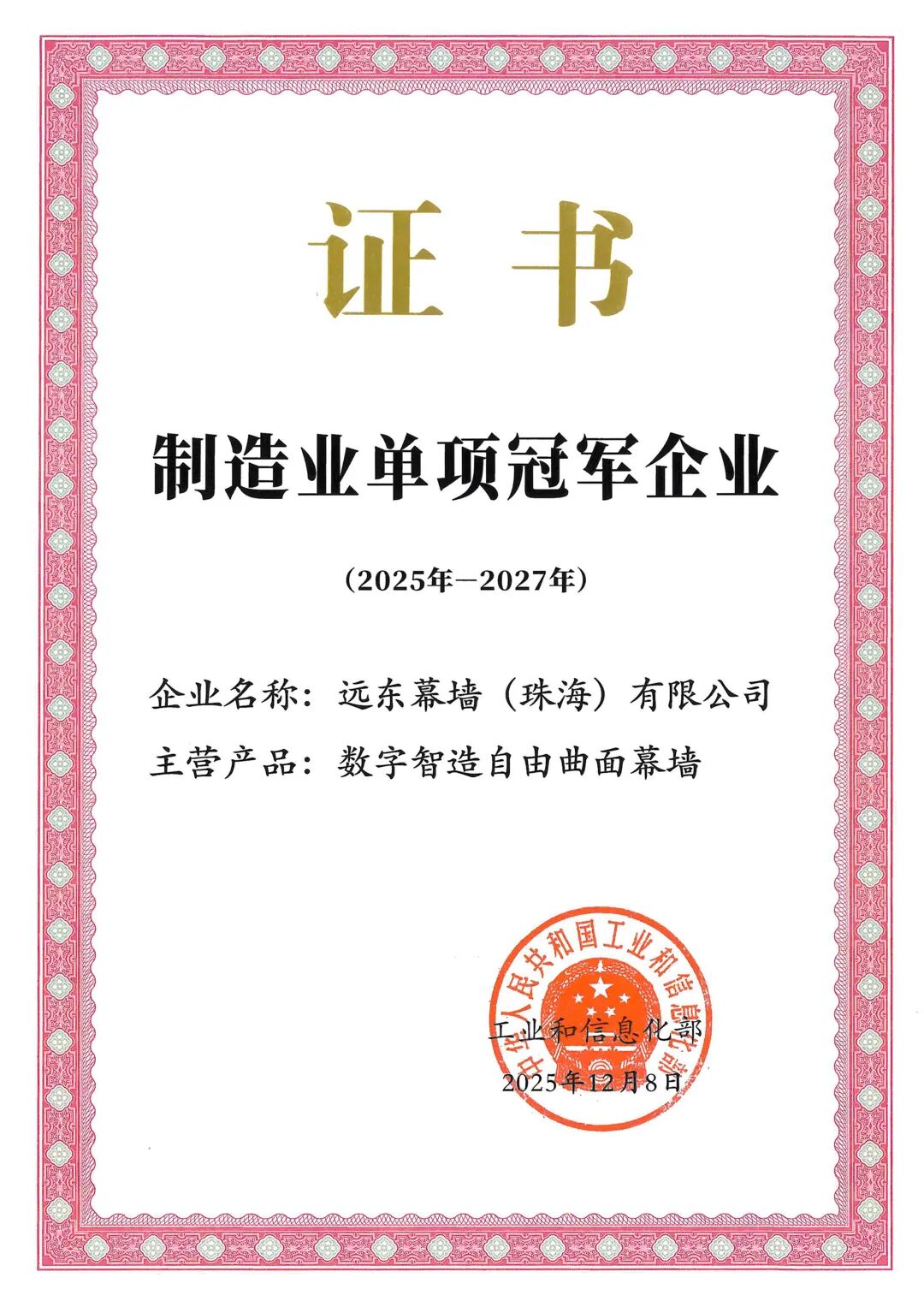 近日,國家工信部正式公布第九批國家級製造業單項冠軍企業名單,中國建築國際旗下遠東智造(珠海)有限公司(簡稱“遠東智造”,原遠東幕牆(珠海)有限公司),憑藉核心產品“數字智造自由曲面幕牆”成功入選。