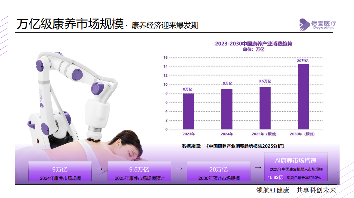 刚需爆发的背后,是传统理疗行业的供给侧严重不足,六大痛点直接制约行业发展:✅人力缺口巨大:养老护理员需求 600 万、缺口 50 万,理疗师年轻从业者占比不足 15%,平均年龄超 45 岁,行业平均离职率 35%,人才断层严重;✅运营成本攀升:理疗师月薪 2019 年 6000 元涨至 2025 年 12000 元,5 年涨幅 100%,培训成本占营收 15%-20%,淡旺季人力闲置加剧成本内耗;✅规模难以复制:名家手法难复刻,标准化缺失,精细化运营无依据,连锁扩张受阻;✅服务标准混乱:依赖人工经验,手法、力度、流程不统一,服务质量波动大,理疗师体力有限导致门店坪效难提;✅用工风险突出:75% 理疗师患腰椎疾病,60% 存在手腕劳损,从业者健康隐患高,团队稳定性差;✅培养周期漫长:合格理疗师培养需 1-3 年,人才供给远滞后于市场增速,50 万行业缺口持续加剧 “用工荒”。德壹破局:AI + 中医理疗,一站式解决行业痛点