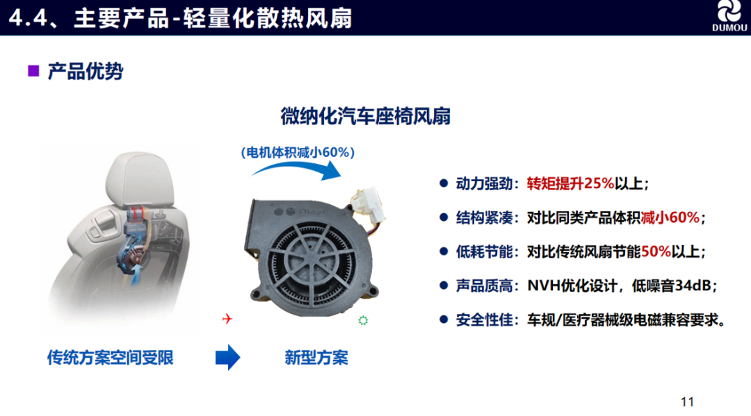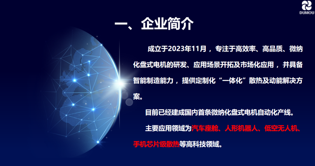 杭州度牟科技有限公司成立于2023年11月,专注于高效率、高品质、微纳化盘式电机的研发、应用场景开拓及市场化应用,并具备智能制造能力,提供定制化"一体化"散热及动能解决方案。目前已经建成国内首条微纳化盘式电机自动化产线。主要应用领域为汽车座舱、人形机器人、低空无人机、手机芯片级散热等高科技领域。