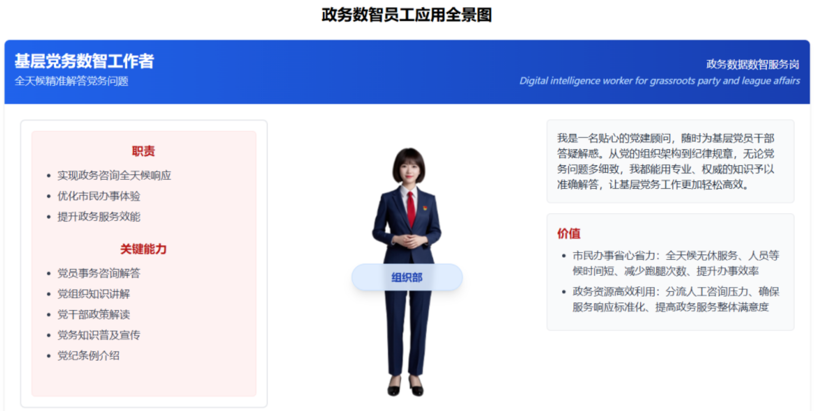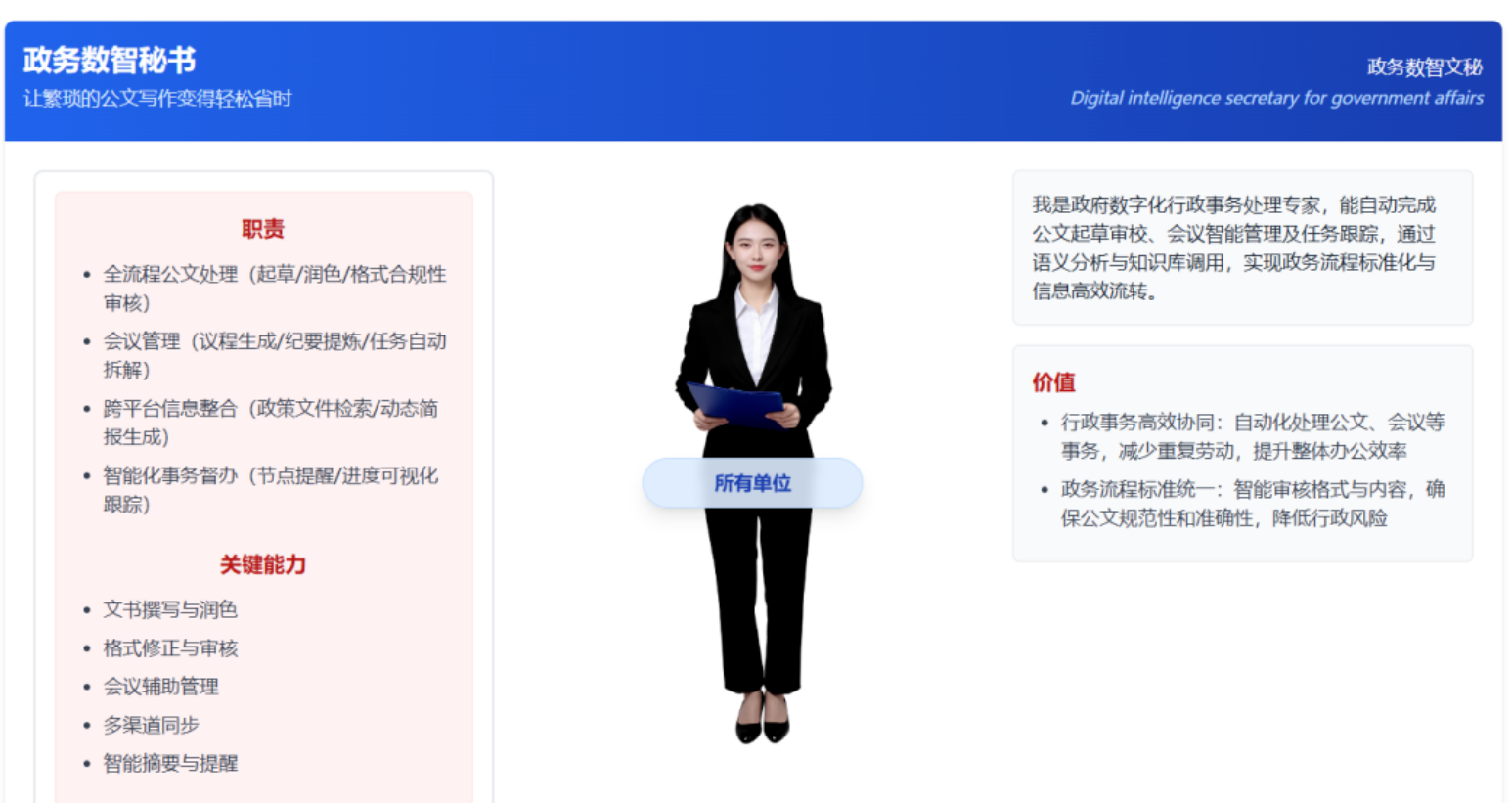 作为政务智能化转型标杆,已在深圳福田区 70 余个委办局 / 街道布局,覆盖超 240 项高频政务场景:政务数智秘书全流程处理公文、管理会议;基层党务数智工作者 7×24 小时解答党务问题;政务助理辅助办公督办,让福田成为全国政务智转先锋,接待百余批次各地调研。