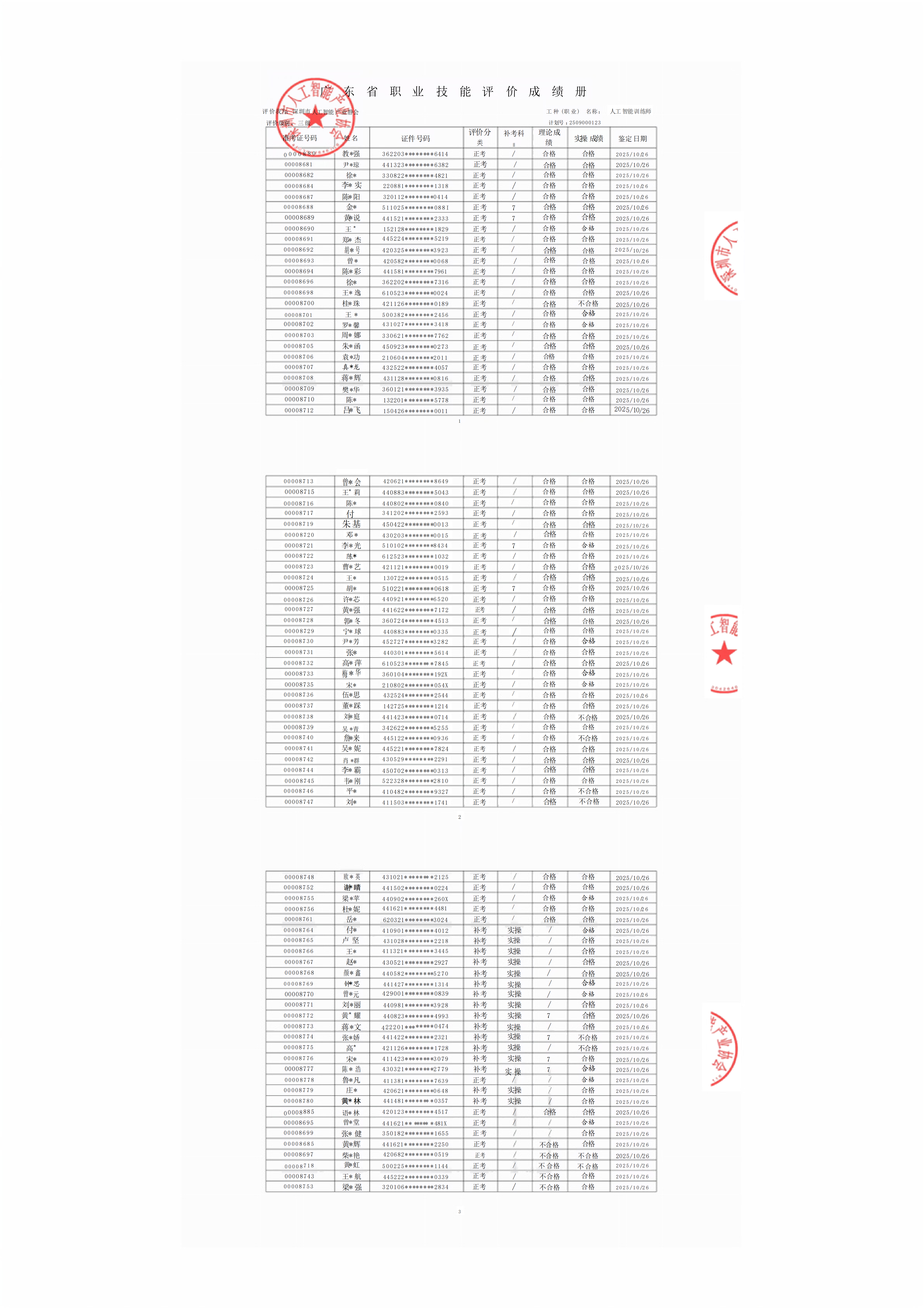 2025年第五批人工智能训练师(三级、四级、五级)职业技能等级认定考试(评价计划编号:2509000123、2509000124、2509000125)顺利完成,考试结果现予公示。公示时间为:2025年11月3日-2025年11月7日止(共五个工作日)。若对下列考生考试结果有异议,请电话或书面向协会部门反映,反映至情况的电话和书面材料要自报或签署真实姓名,不报或不签署真实姓名的,一律不予受理。
