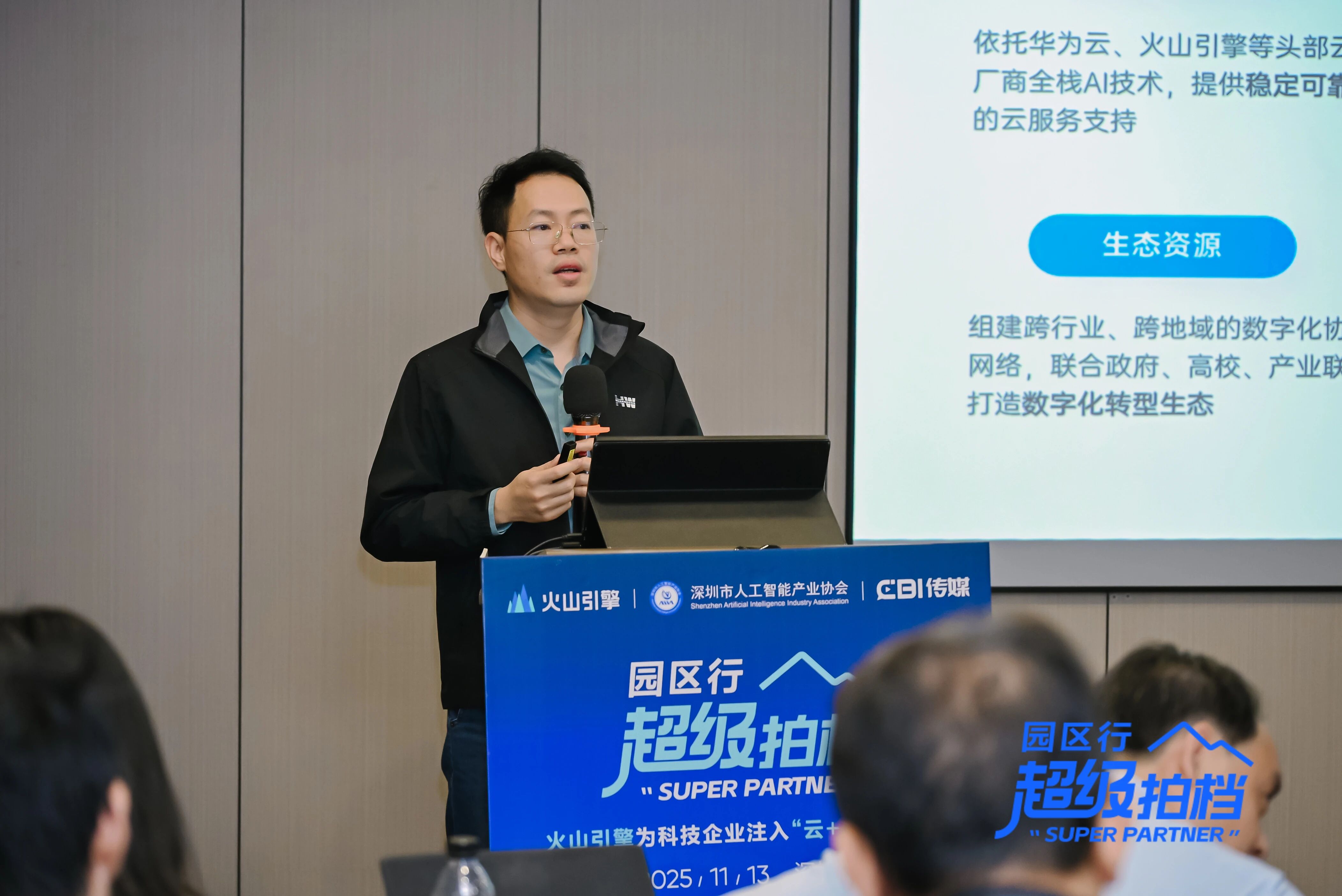 2025年11月13日,以 “火山引擎为科技企业注入‘云+AI’双引擎” 为主题的超级拍档园区行系列活动来到了深圳南山。火山引擎携手深圳市人工智能产业协会、CBI传媒、厦门碧谷科技有限公司,与来自人工智能、云计算和企业服务领域的专家与企业代表,围绕大模型落地路径、数据智能体应用、企业数字化转型等热点话题展开深度探讨,共同探索科技企业在AI时代的破局之道。