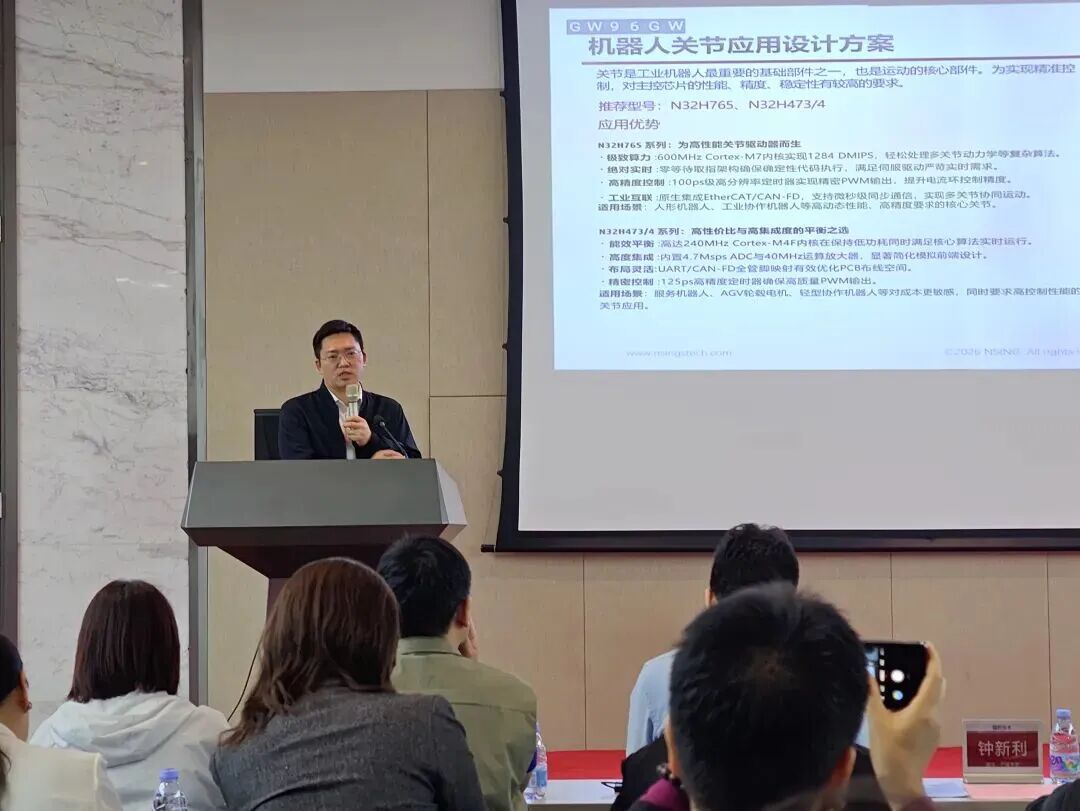 在技术分享环节,国民技术副总钟新利以《N32MCU助力机器人实现灵巧控制与安全连接》为题,展示了国产芯片在智能终端领域的创新突破;详细介绍了国民技术在机器人控制与安全连接领域的芯片解决方案,重点阐述了实时控制系统、关节模组、微型驱动系统和多模态感知系统等关键技术,强调高性能处理器和硬件安全引擎对机器人精确控制和数据加密的重要性,并展示了公司产品在关节模组、灵巧手和电源管理等核心部件上的应用案例及行业合作伙伴。
