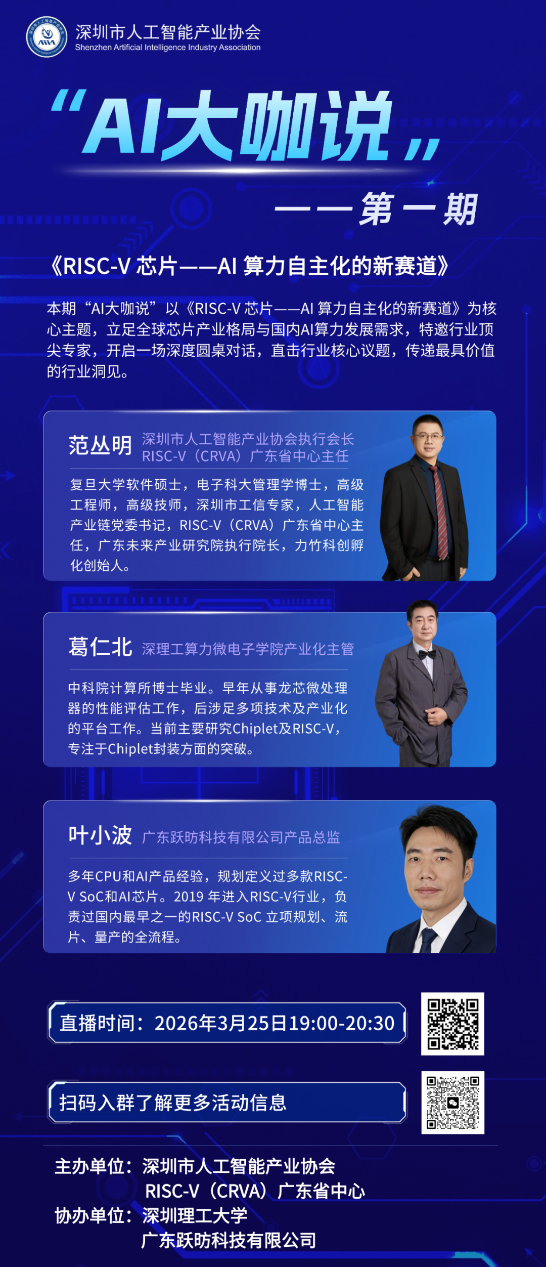 本次专访由深圳市人工智能产业协会执行会长、RISC-V(CRVA)广东省中心主任范丛明主持,特邀嘉宾为深理工算力微电子学院产业化主管葛仁北教授、广东跃昉科技有限公司产品总监叶小波,确保对话的专业度与前瞻性。
