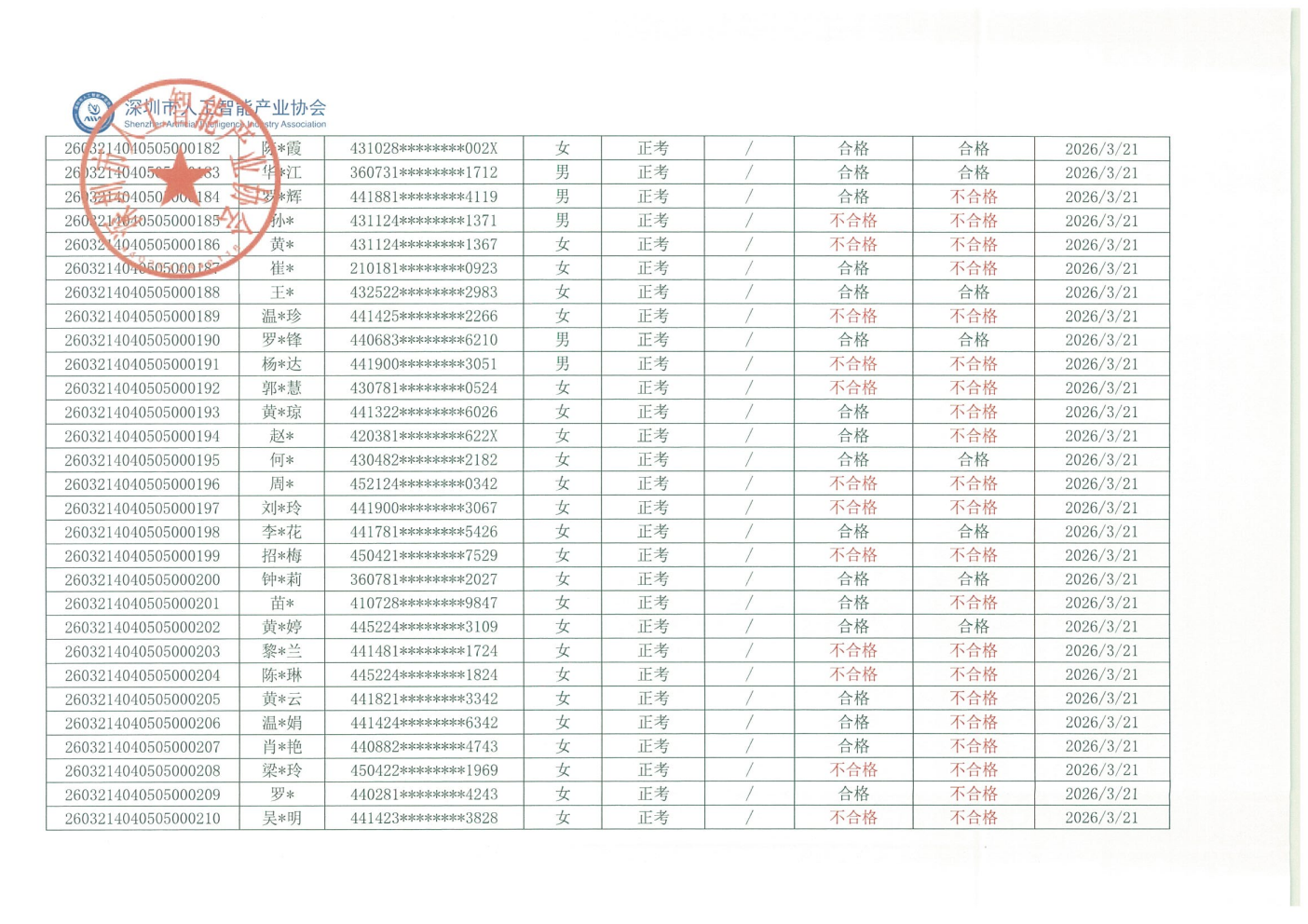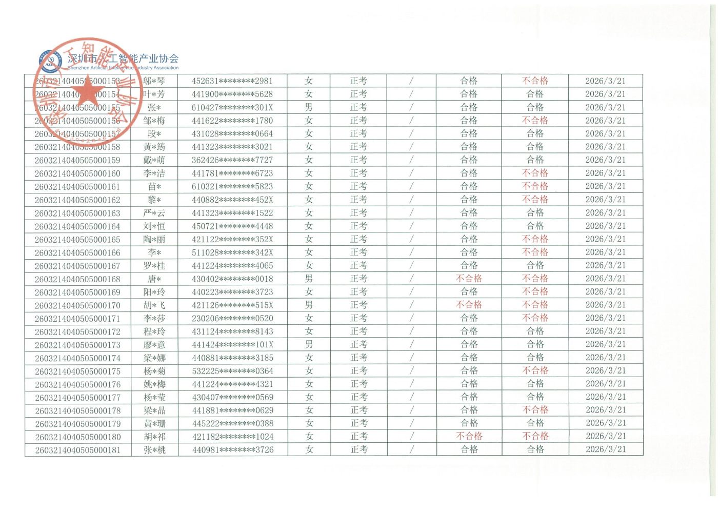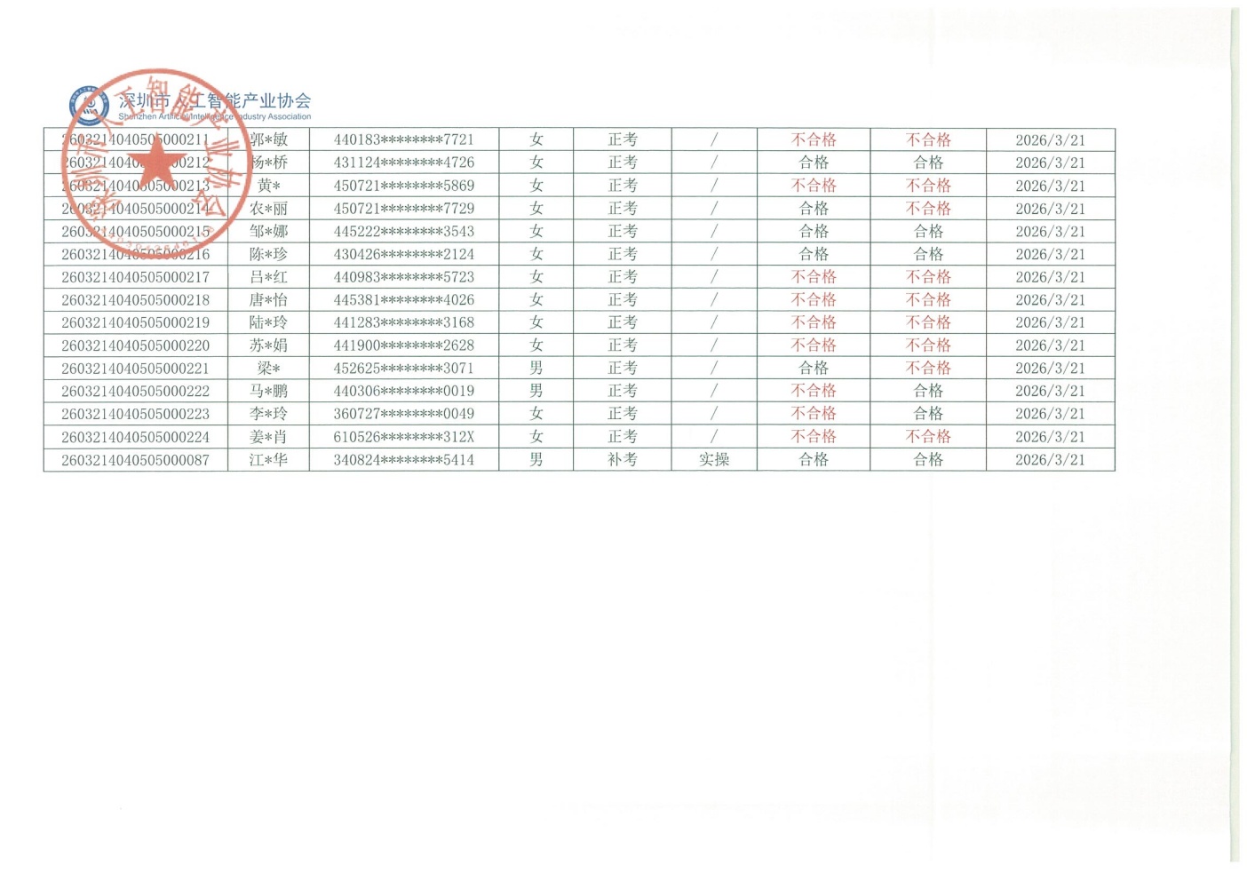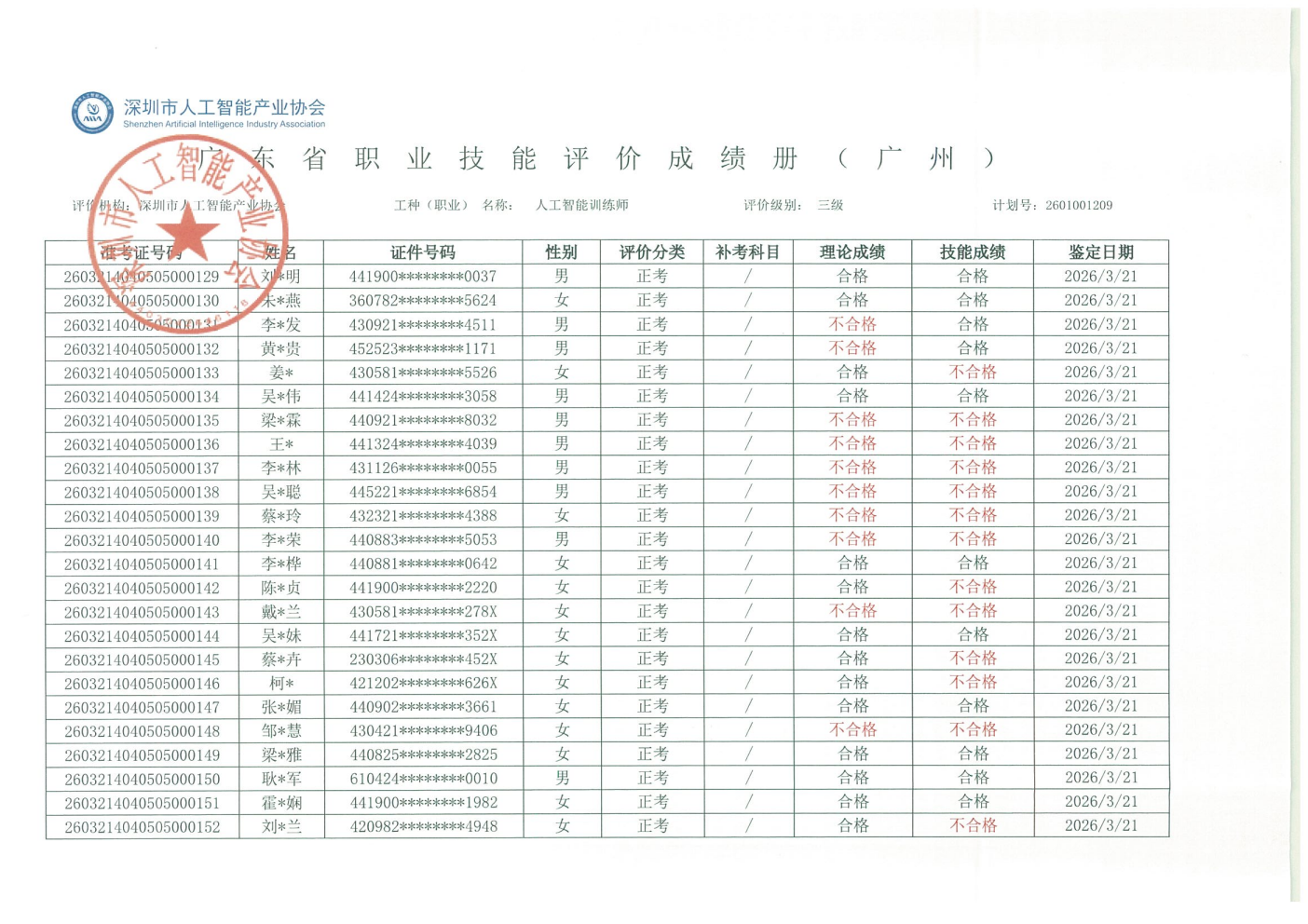 2026年广州市第三批人工智能训练师职业技能等级认定考试(评价计划编号:2601001209、2601001211)顺利完成,考试结果现予公示。公示时间为:2026年3月27日-2026年4月2日止(五个工作日)。若对下列同志考试结果有异议,请电话或书面向协会部门反映,反映至情况的电话和书面材料要自报或签署真实姓名,不报或不签署真实姓名的,一律不予受理。
