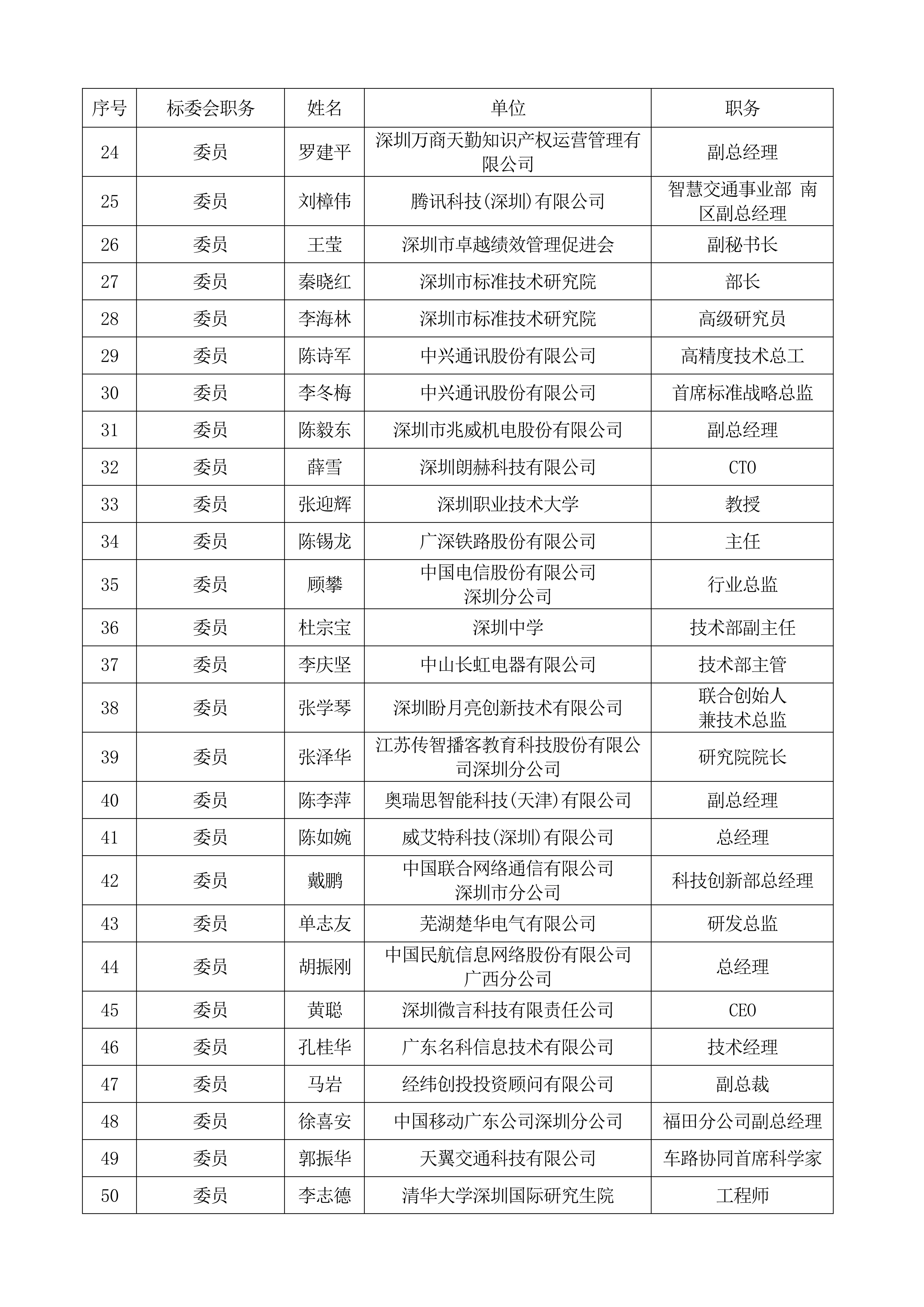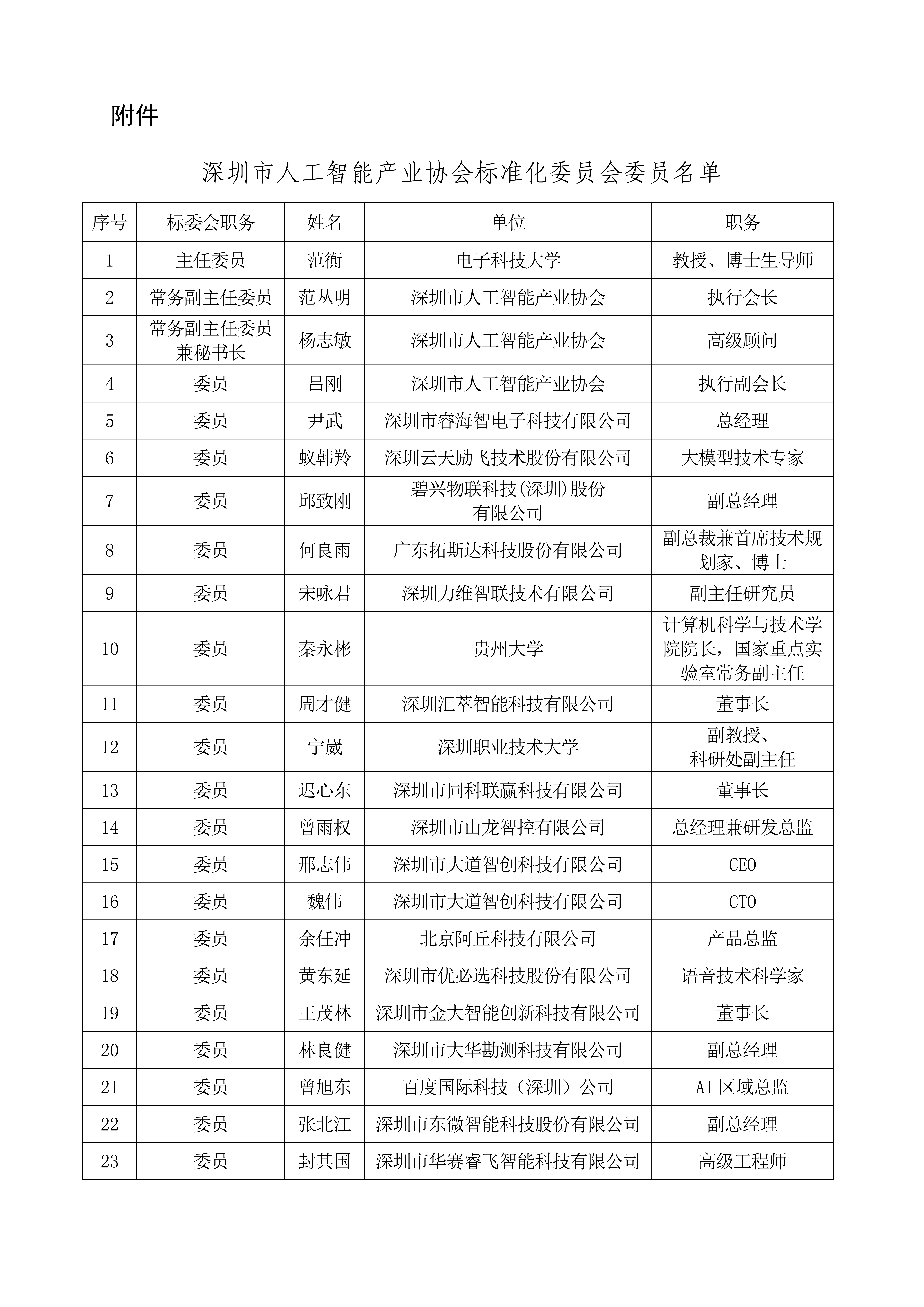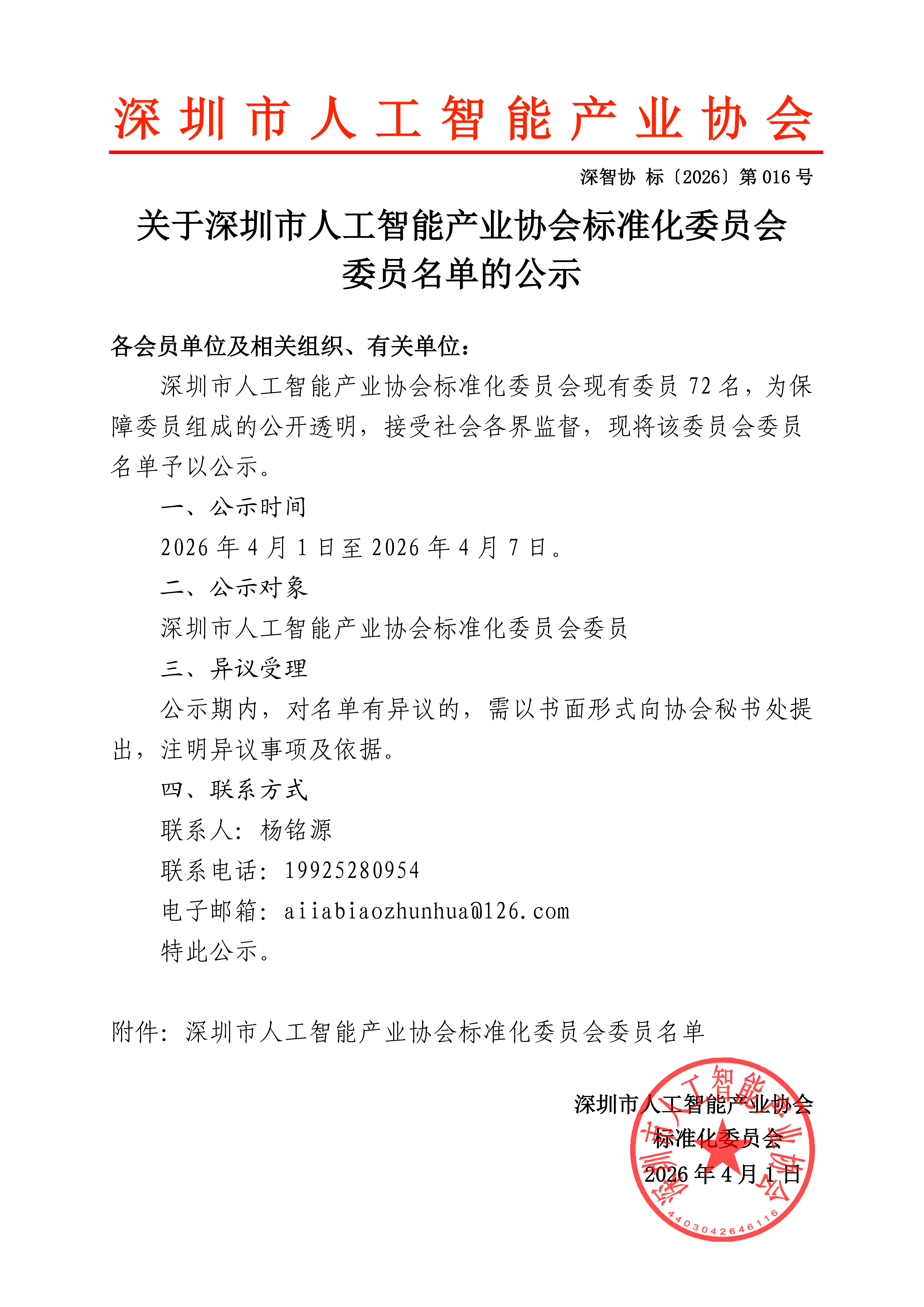 关于深圳市人工智能产业协会标准化委员会 委员名单的公示
