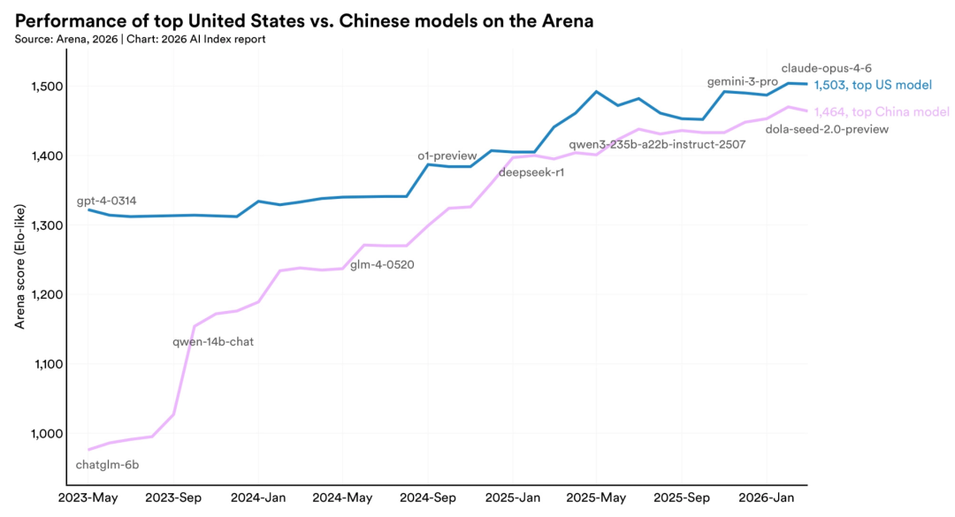 斯坦福《2026年AI指数报告》明确指出,美国和中国模型自2025年初以来已多次在性能排名顶端交替。截至2026年3月,美国顶尖模型Claude Opus 4.6与中国顶尖模型的Elo评分差距仅为2.7%。