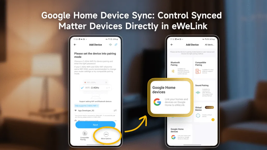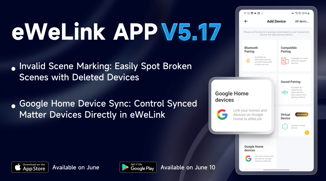 此外,用户现可直接在eWeLink App内,以家中的Google Nest Hub为控制中心(Controller),便捷地添加新的Matter设备。设备添加成功后,会同时出现在eWeLink与Google Home两个平台中,实现双平台统一控制。