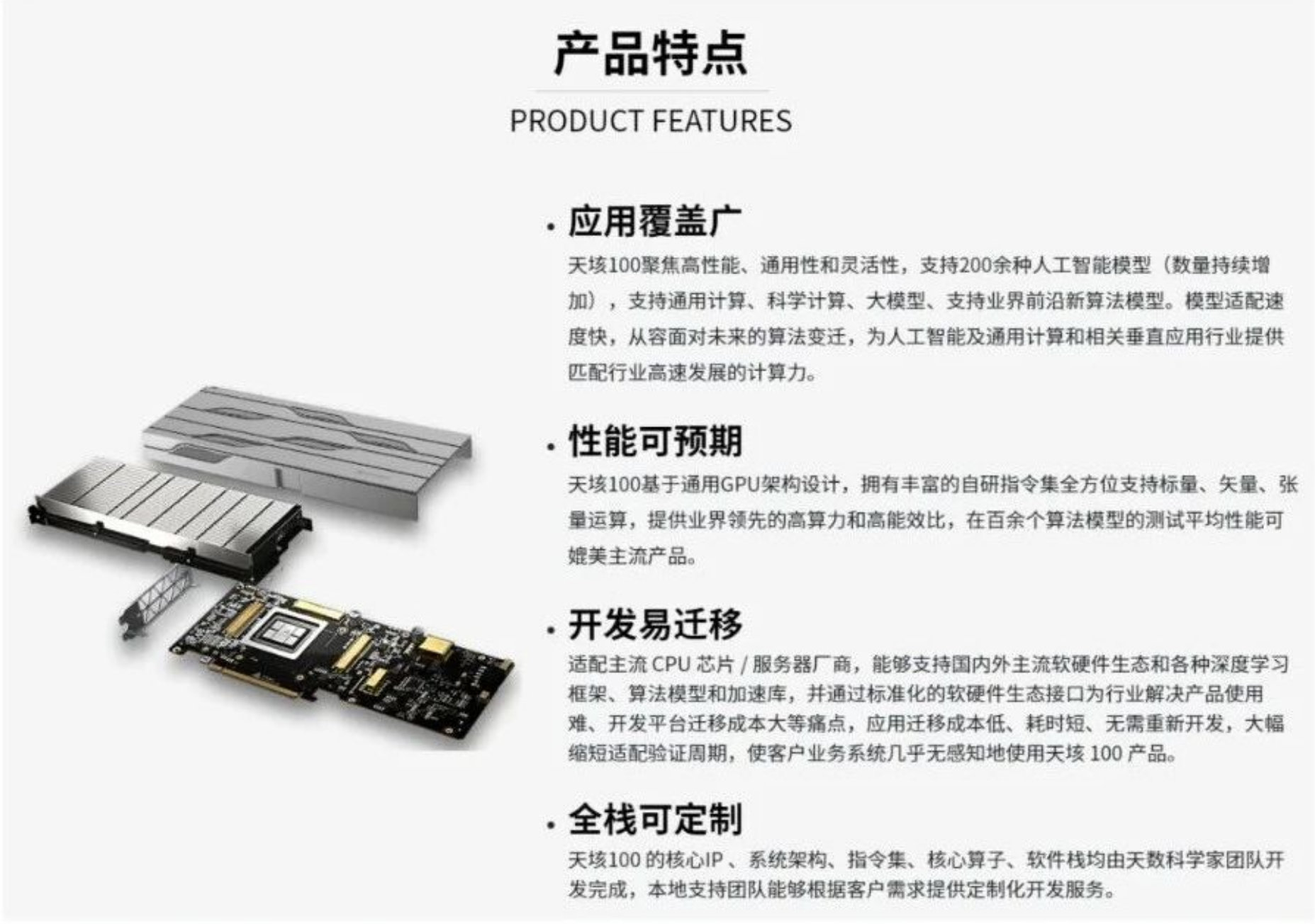天数智芯通用GPU产品涵盖天垓及智铠系列,具有优效能、易迁移、高通用等领先优势,全面兼容国内外主流 AI 生态以及各类深度学习框架。从系统架构、指令集,到核心算子、软件栈,均为自主研发,可独立发展演进。