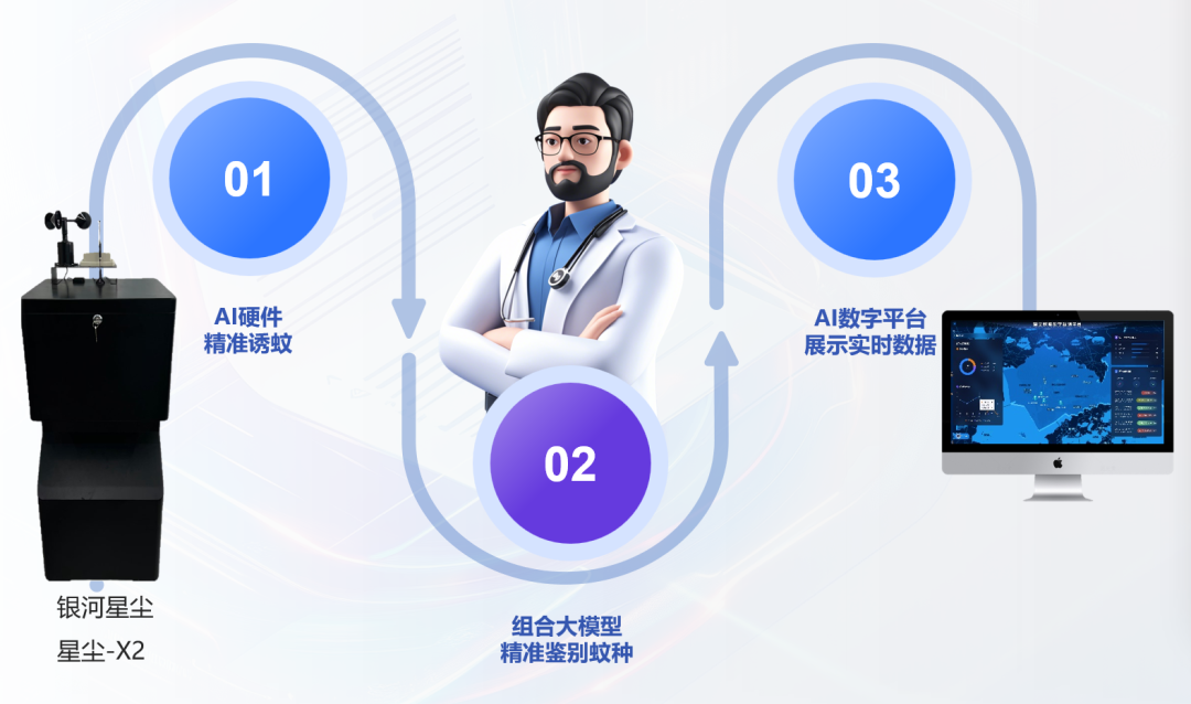 刘起勇详解,AI监测预警是精准防控的 “前哨”,为 “地空一体” 防控提供数据与策略支撑。银河星尘融合病媒AI大模型、智能物联网设备及数据分析技术,构建起完整防控系统: