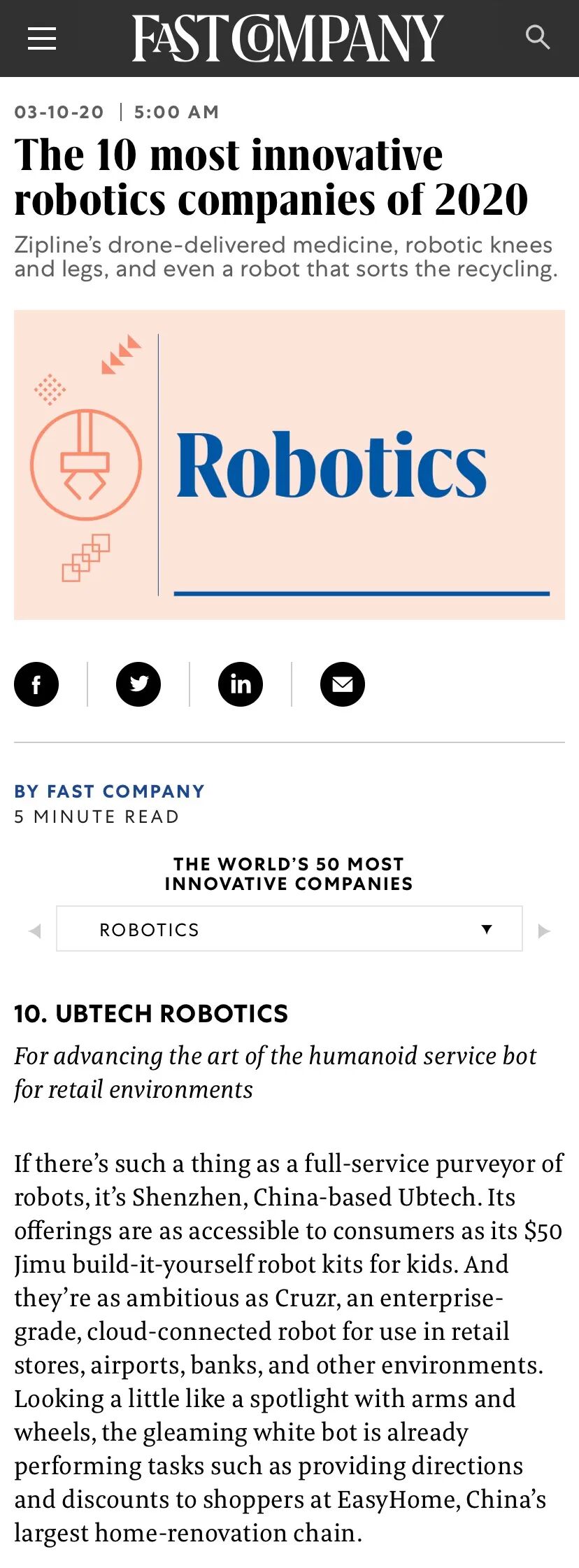 “如果你要我举例一家能够提供全方位机器人服务的公司,我会提名来自中国深圳的优必选科技。”《Fast Company》对优必选科技给予了这样的评价。在上榜理由中,还特别提到了优必选机器人在教育、商用服务领域所取得的应用成果。
