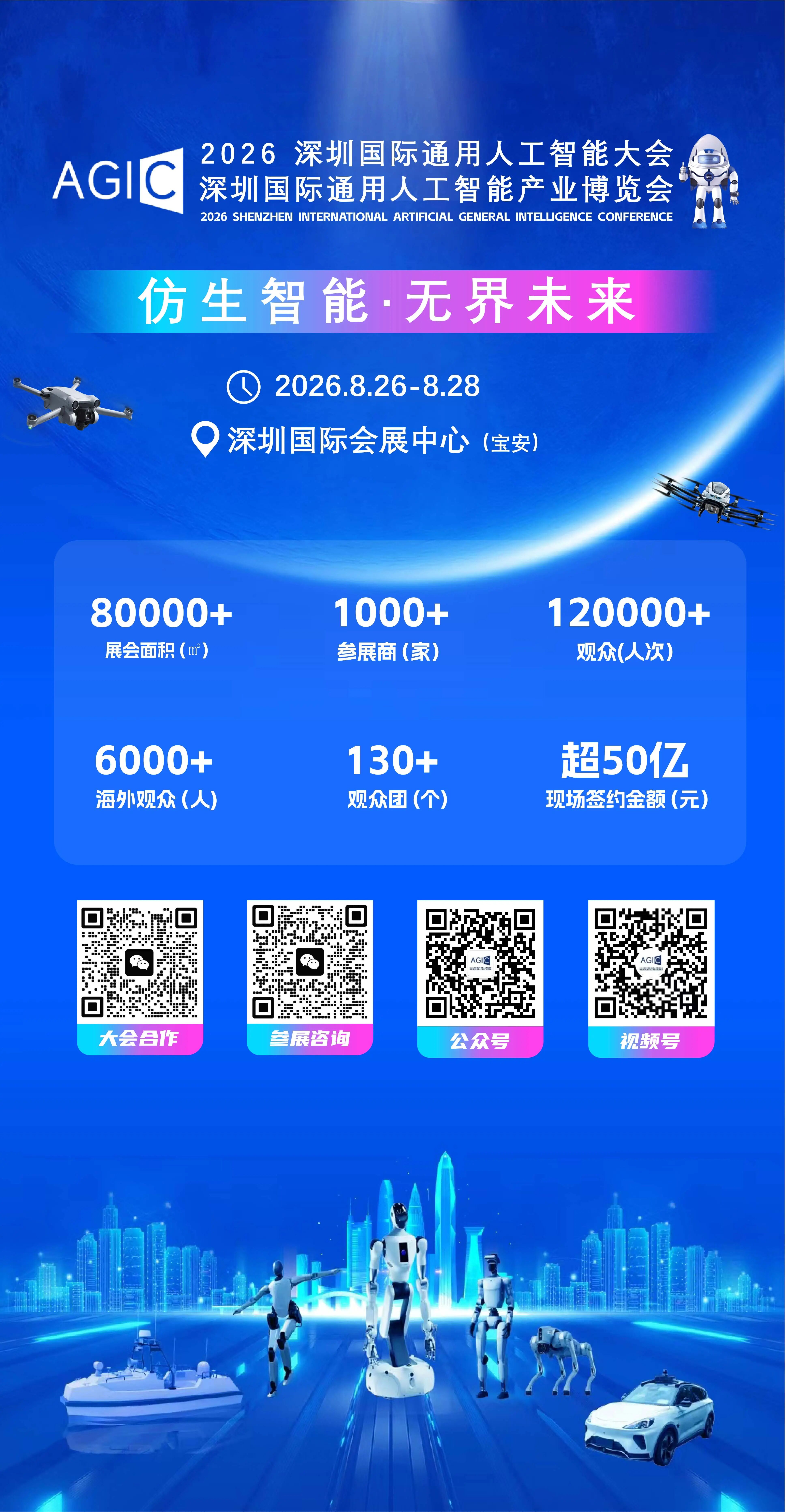 2026 AGIC 深圳国际通用人工智能大会暨深圳国际通用人工智能产业博览会发挥“行业风向标·场景应用示范·产业加速器”的作用,重点打造“一会一展N论坛”三大核心板块,构建“会、展、销”三位一体的核心支撑体系,展览面积达8万平方米,集结了华为、腾讯、数影科技、联通、志奋领、研祥高科、华成工控、美丽魔方、西安交大、等近千家展商,观众预约报名达到15万人,是目前全世界行业规模最大的大会。