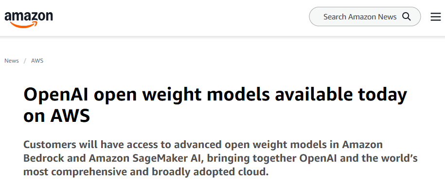 当地时间8月5日,AWS宣布将在Bedrock和SageMaker平台上提供由OpenAI开发的开放权重模型gpt-oss-120b和gpt-oss-20b。