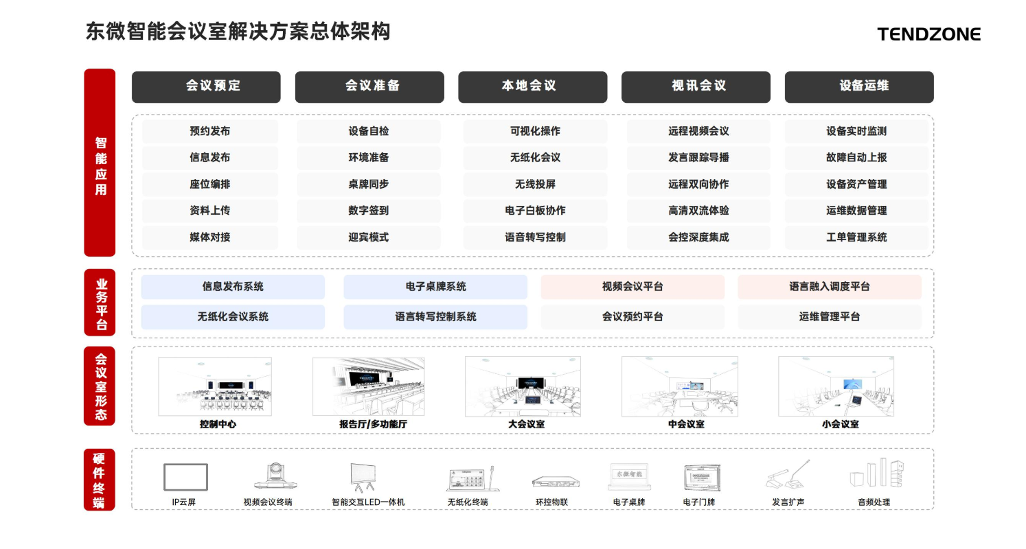 作为专业音视频领域头部企业,东微 TENDZONE 智能会议室解决方案,以清晰分层架构适配小、中、大各类会议室,靠硬核设备与技术打造高效会议体验,核心架构一目了然!