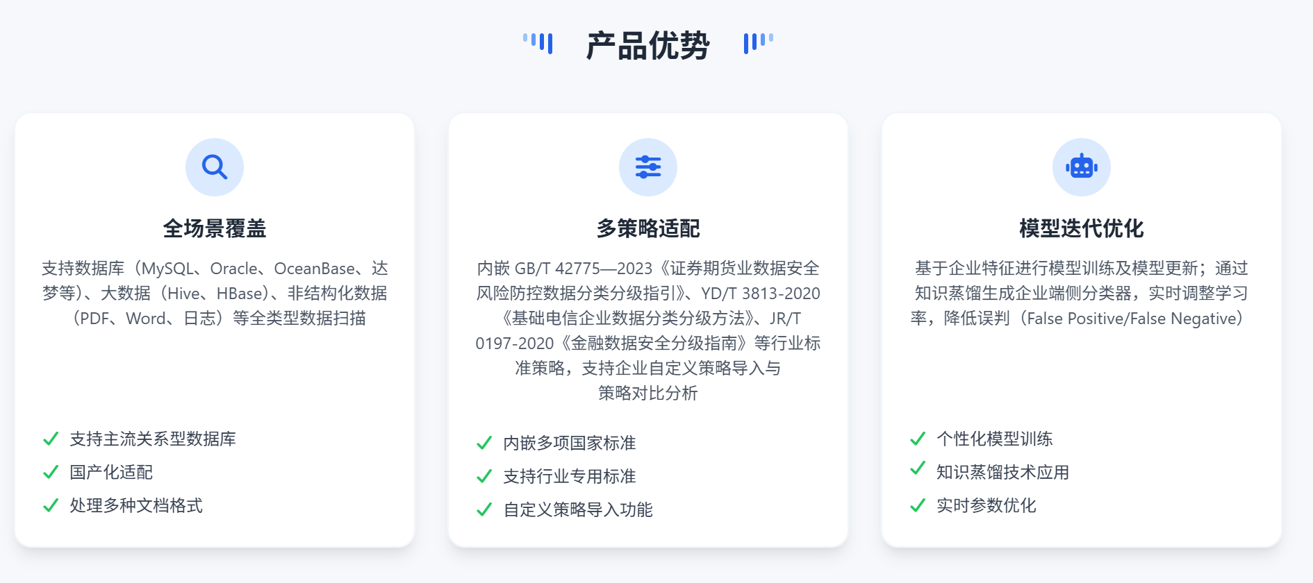 深度内嵌 GB/T 42775—2023《证券期货业数据安全风险防控数据分类分级指引》、YD/T 3813-2020《基础电信企业数据分类分级方法》、JR/T0197-2020《金融数据安全 数据安全分级指南》等权威行业分类分级标准,更支持企业按需个性化调整策略。针对结构化与非结构化数据,可实现智能精准识别与分级,高效覆盖多元数据场景。 模型搭载持续迭代优化机制,在最小化人工干预的基础上,精准匹配企业个性化合规诉求,为数据安全管控体系的落地筑牢核心根基。