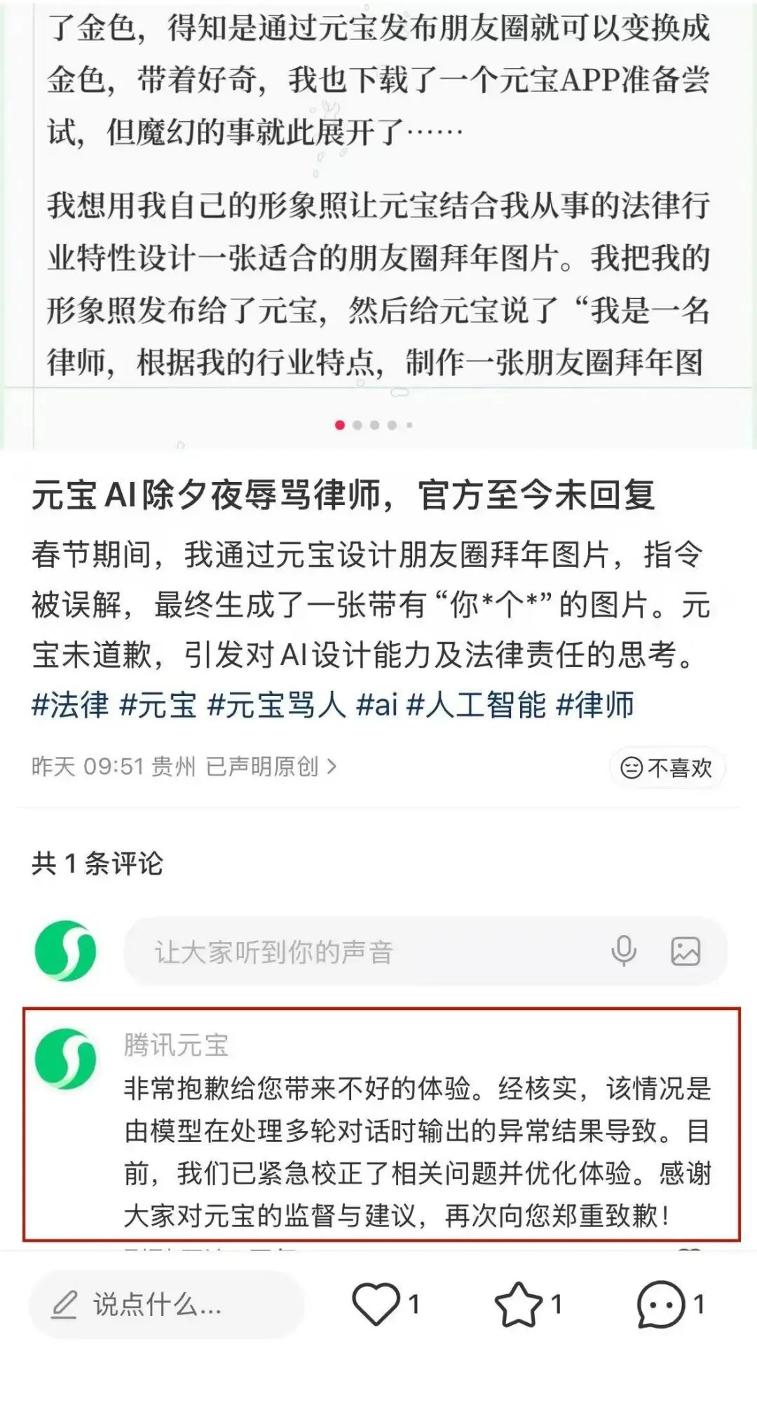 最近,有网友在社交平台分享一则今年春节期间的经历——使用元宝生成个人拜年海报,但生成的海报中却出现了颇为难听的脏话。