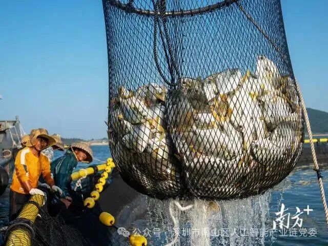 广东茂名,工人们正在打捞重力式网箱中成熟的金鲳鱼。这一批鱼将发往香港市场。张令/摄